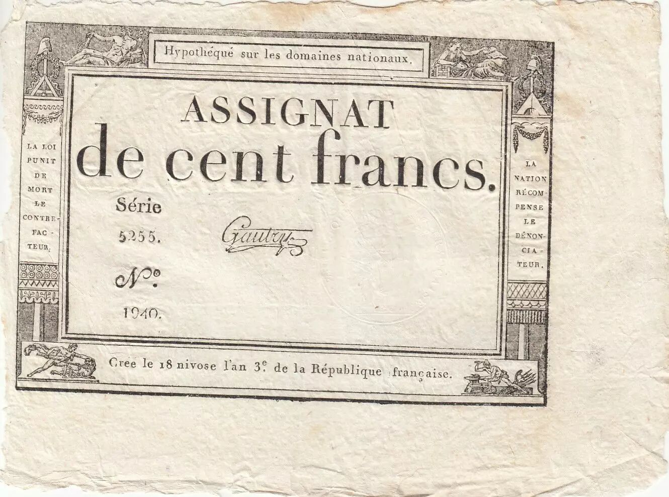 Banknote France 100 Francs - 18 Nivose An III - (07.01.1795) - Sign. Gautry - Serial 5255