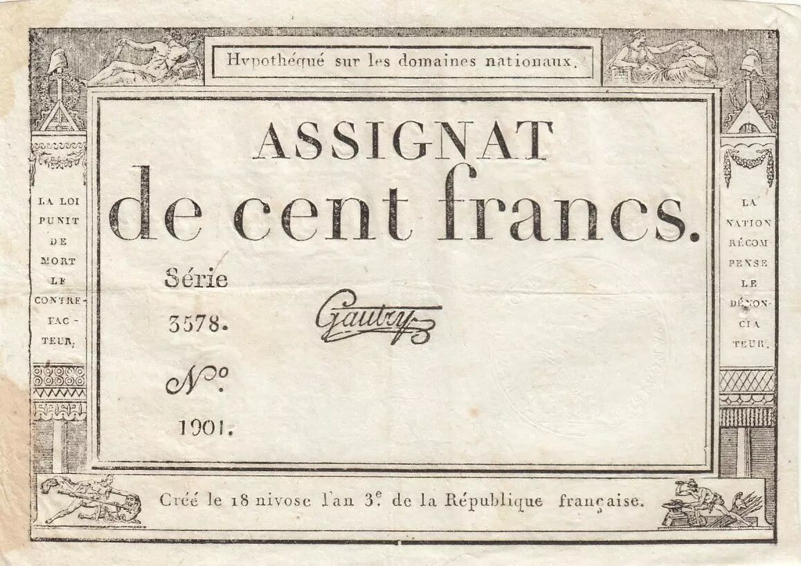 Billet France 100 Francs - 18 Nivose An III - (07.01.1795) - Sign. Gautry - Série 3578