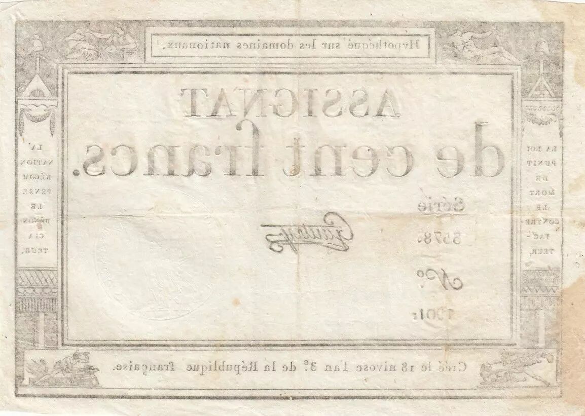 Accueil > Archivage > archivage-Billets Français > France 100 Francs - 18 Nivose An III - (07.01.1795) - Sign. Gautry - Série 3578