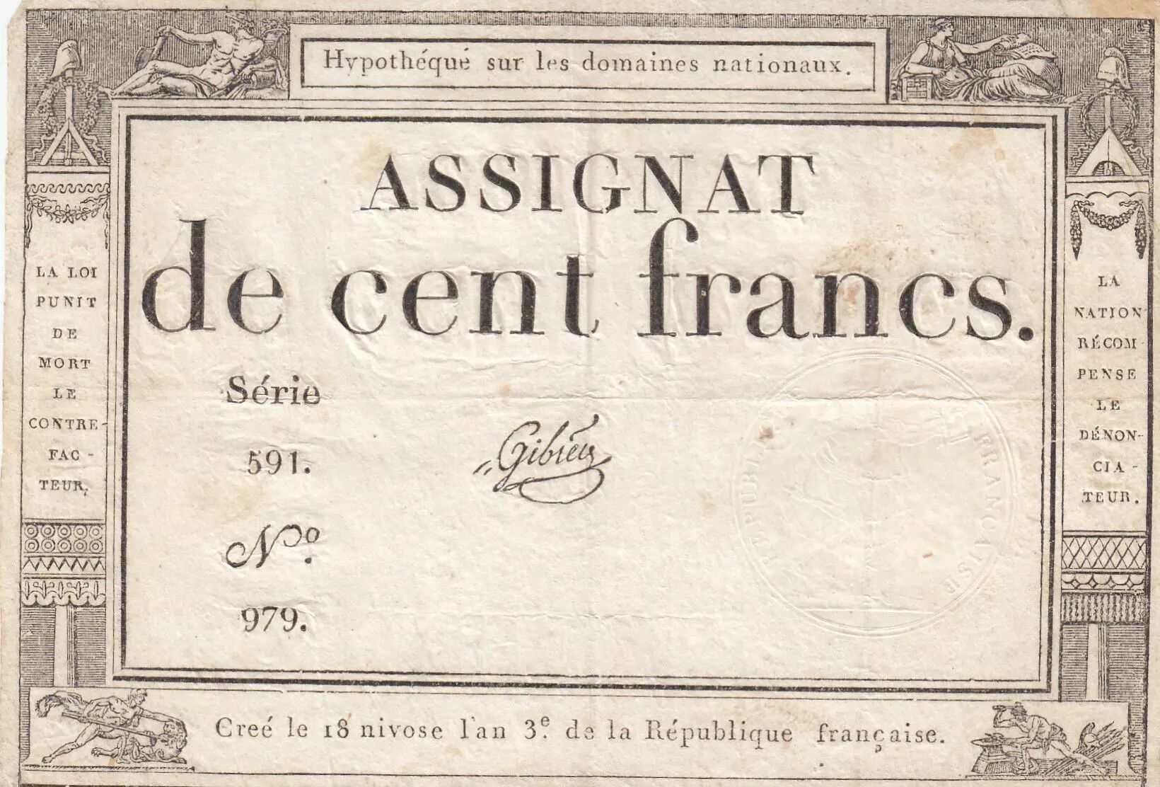 Billet France 100 Francs - 18 Nivose An III - (07.01.1795) - Sign. Gibier - L.173 - Série 591