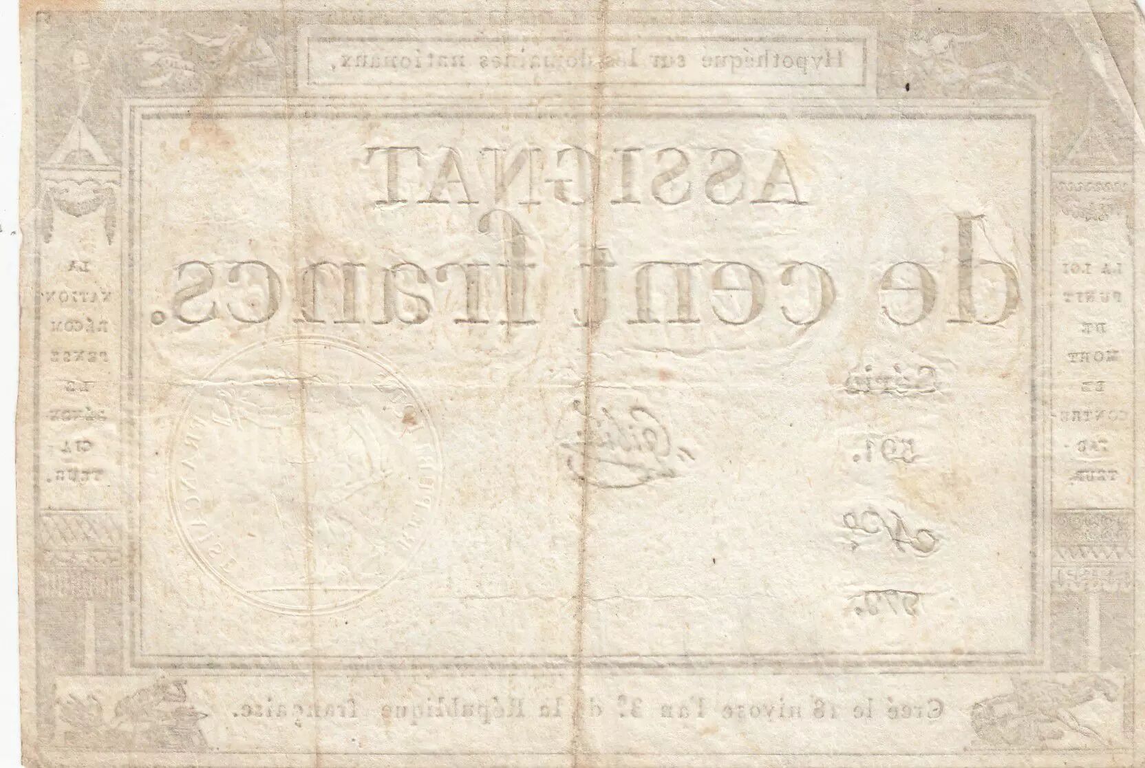 Banknote France 100 Francs - 18 Nivose An III - (07.01.1795) - Sign. Gibier - P.A.78 - Serial 591