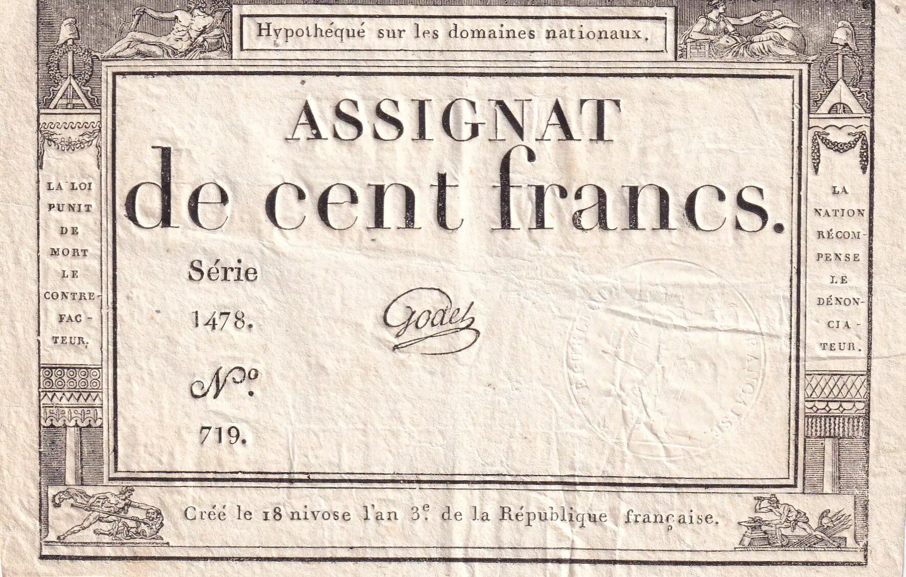 Banknote France 100 Francs - 18 Nivose An III - (07.01.1795) - Sign. Godet - Serial 1478 - P.78