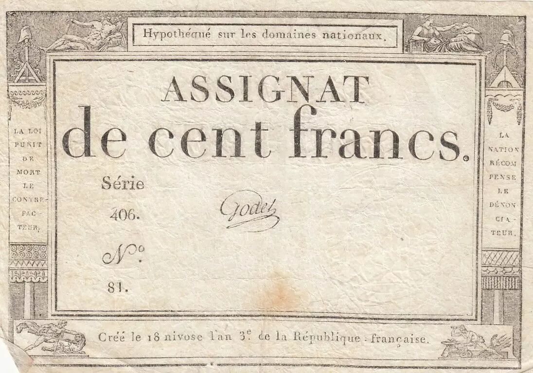 Accueil > Billets Français > Assignats > 100 Francs > France 100 Francs - 18 Nivose An III - (07.01.1795) - Sign. Godet - Série 406