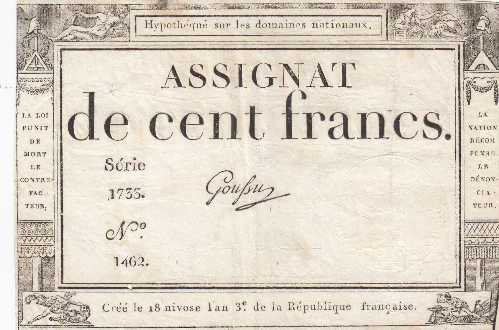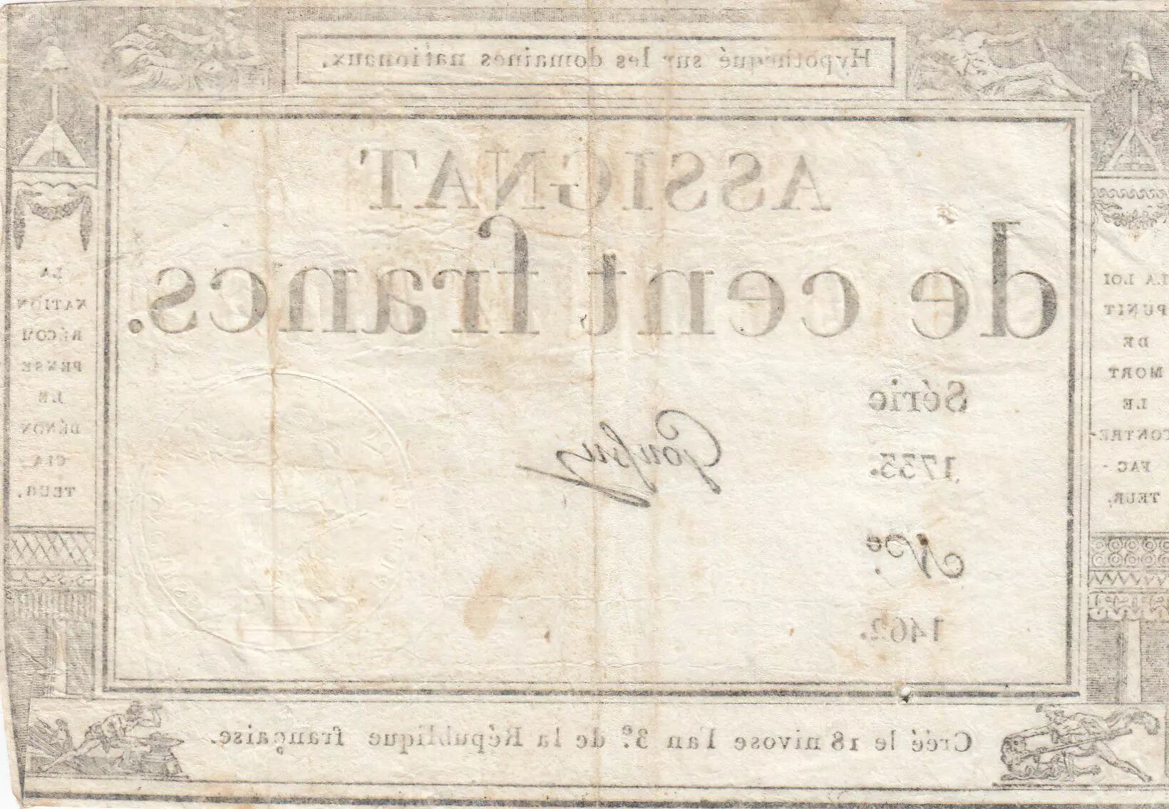 Banknote France 100 Francs - 18 Nivose An III - (07.01.1795) - Sign. Goussu - P.A.78 - Serial 1733