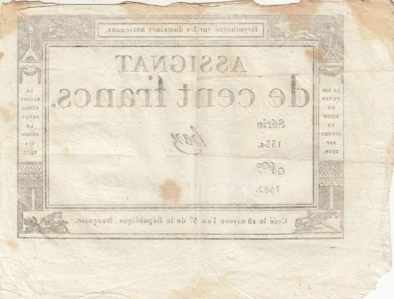 Home > French Banknotes > Assignats > 100 Francs > France 100 Francs - 18 Nivose An III - (07.01.1795) - Sign. Haze - Serial 1334