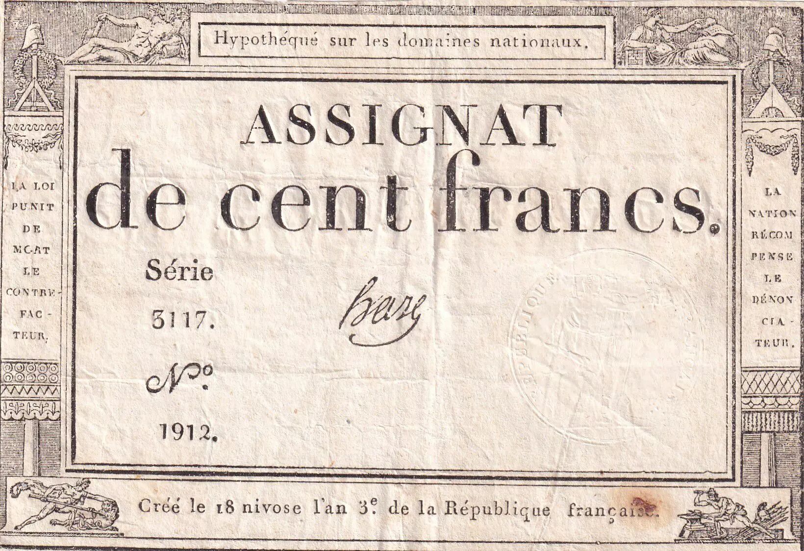 Banknote France 100 Francs - 18 Nivose An III - (07.01.1795) - Sign. Haze - Serial 3117 - P.78