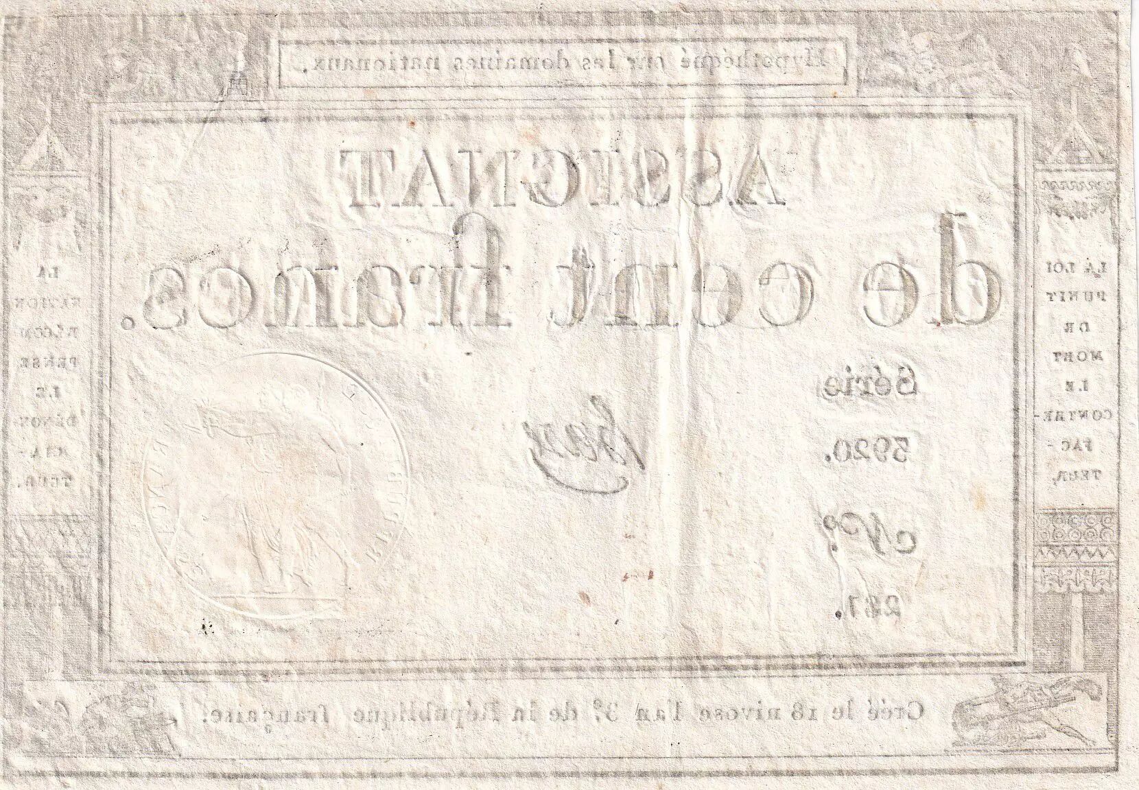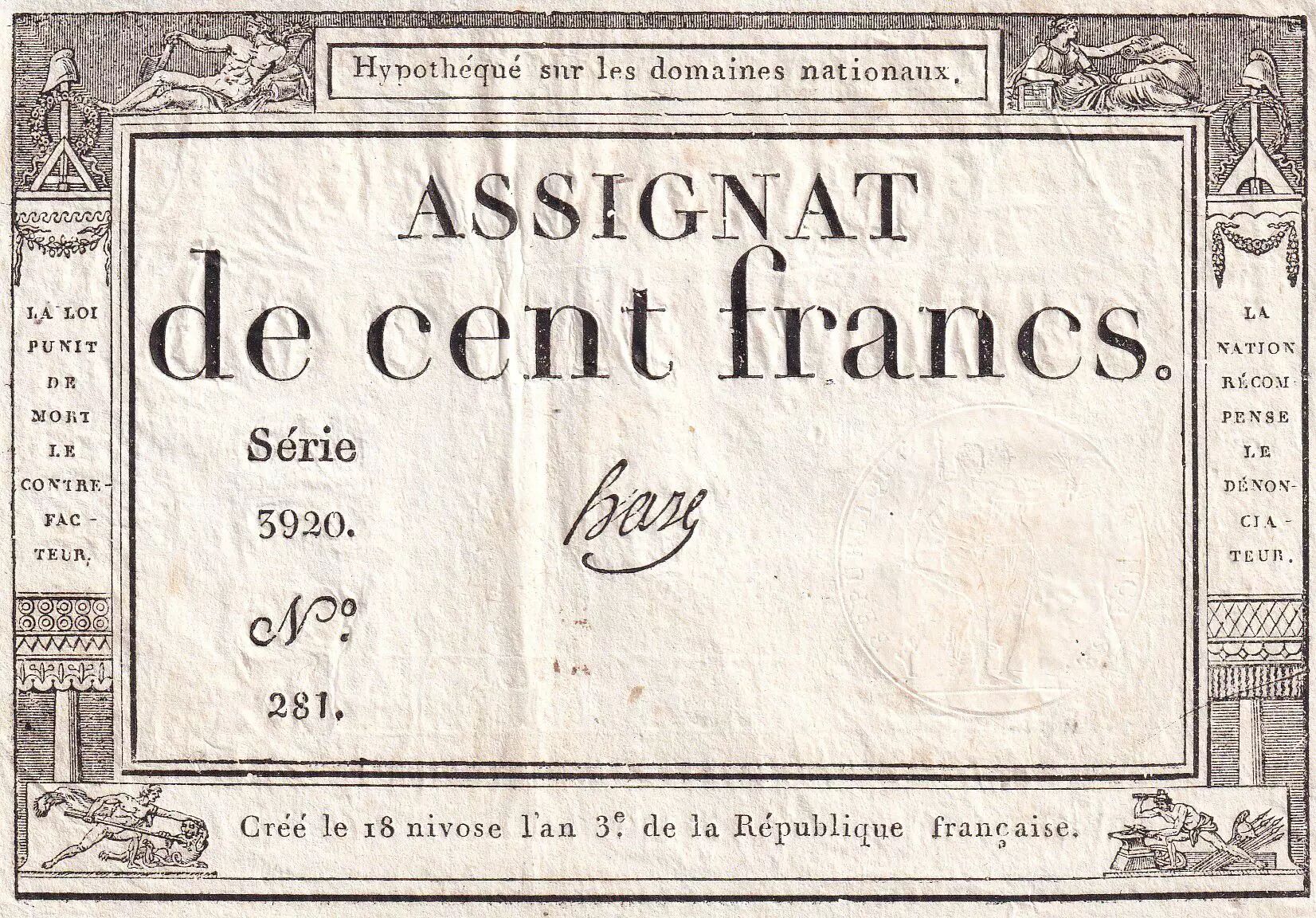 Banknote France 100 Francs - 18 Nivose An III - (07.01.1795) - Sign. Haze - Serial 3920 - P.78