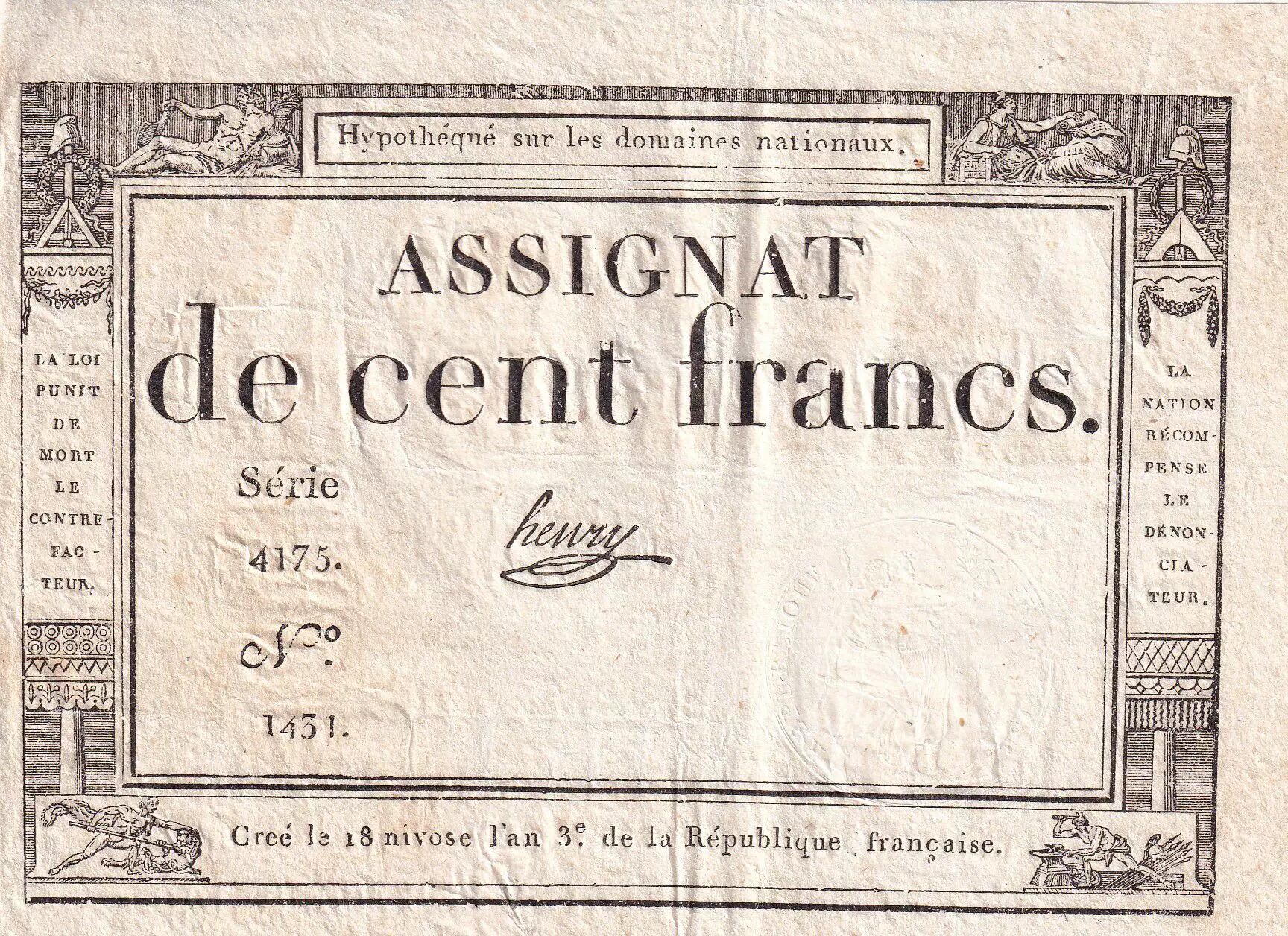 Banknote France 100 Francs - 18 Nivose An III - (07.01.1795) - Sign. Henry - Serial 4175 - P.78