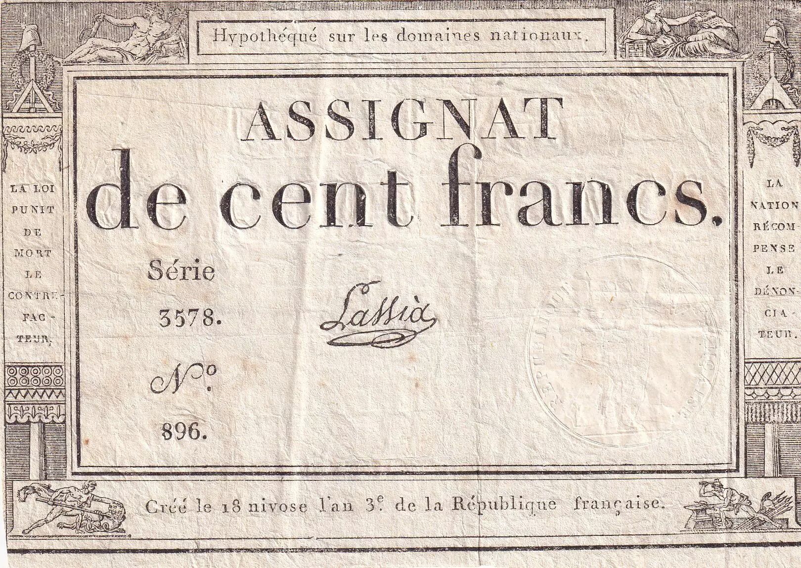 Banknote France 100 Francs - 18 Nivose An III - (07.01.1795) - Sign. Lassia - Serial 3578 - P.78