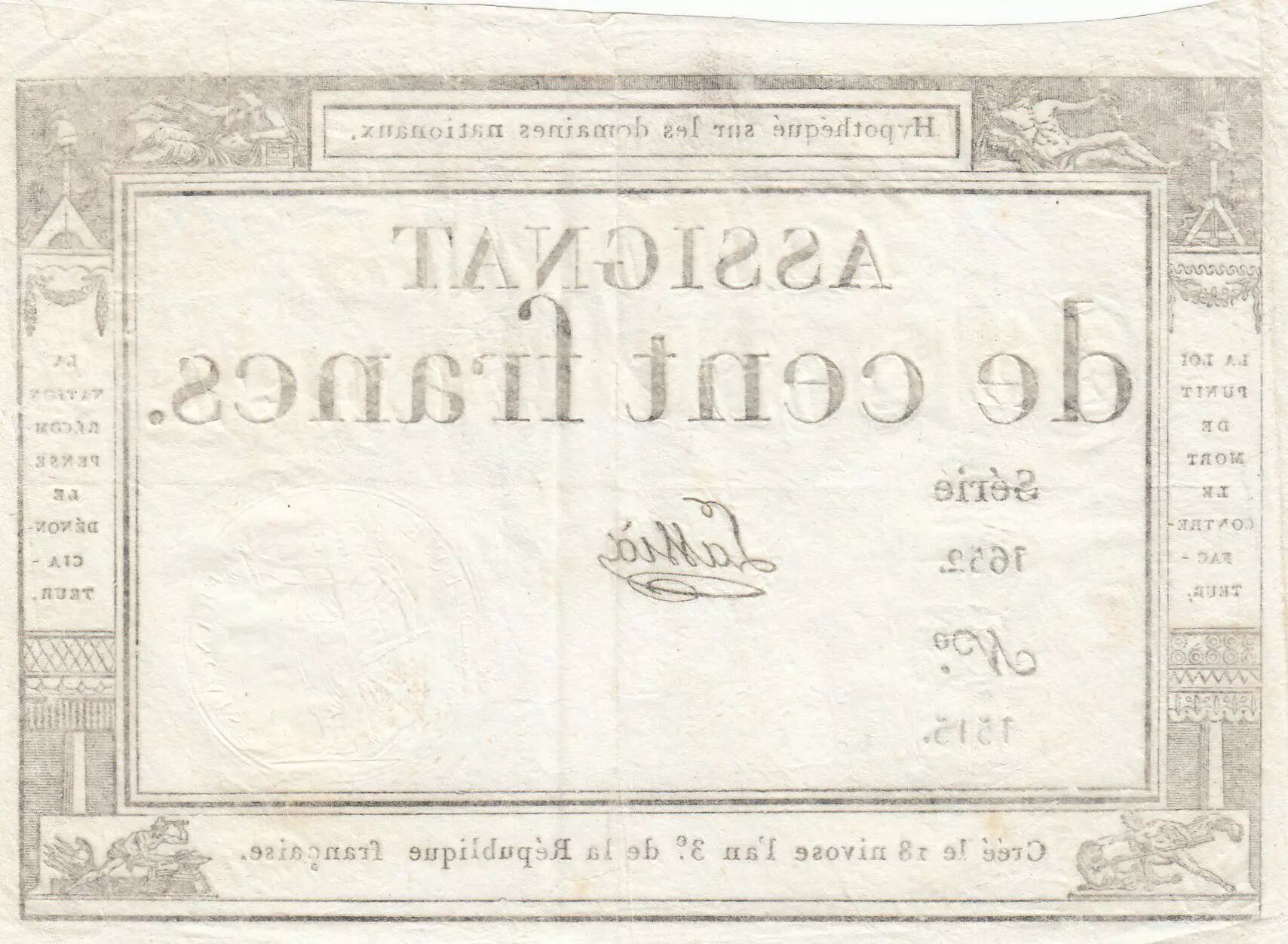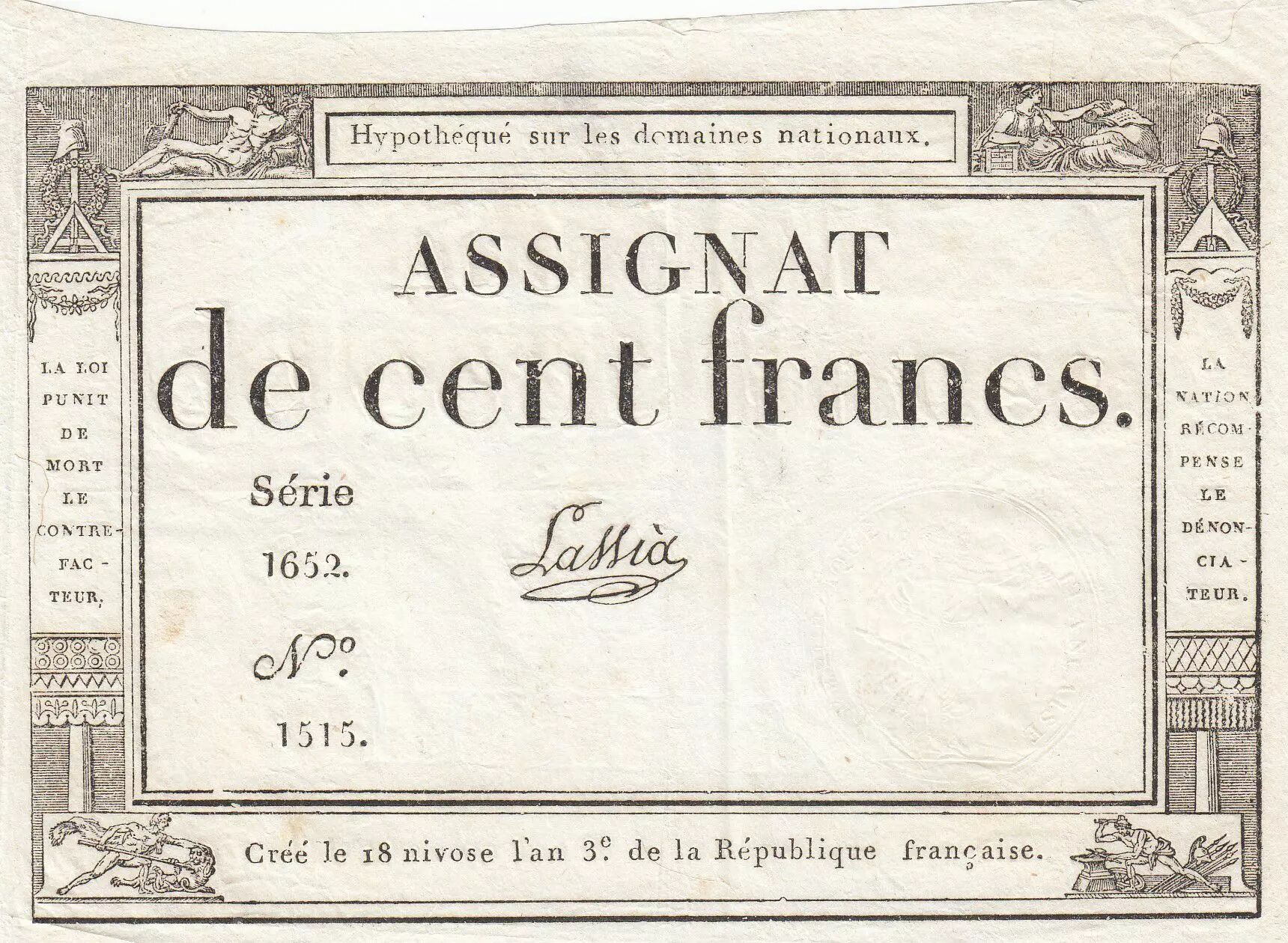 Accueil > Archivage > France 100 Francs - 18 Nivose An III - (07.01.1795) - Sign. Lassia - Série 1652