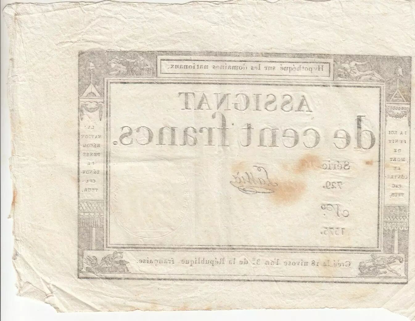 Accueil > Billets Français > Assignats > 100 Francs > France 100 Francs - 18 Nivose An III - (07.01.1795) - Sign. Lassia - Série 729