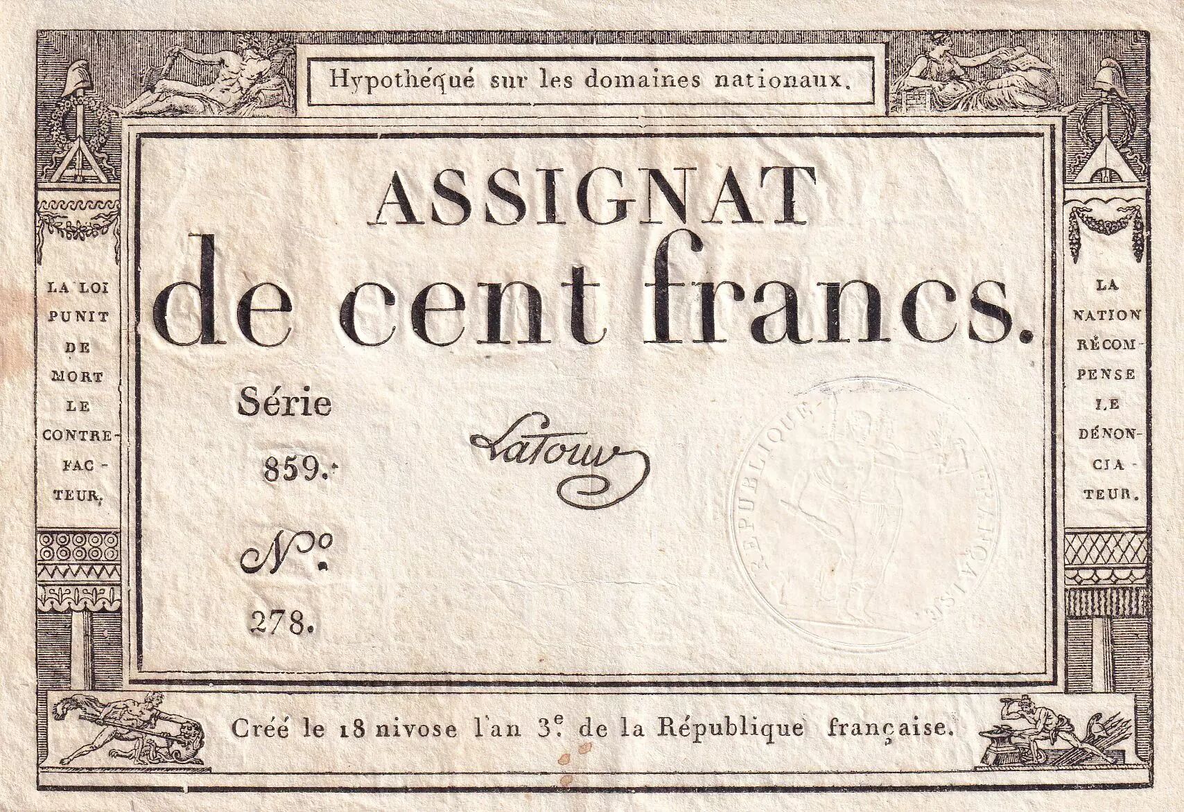 Banknote France 100 Francs - 18 Nivose An III - (07.01.1795) - Sign. Latour - Serial 859 - P.78