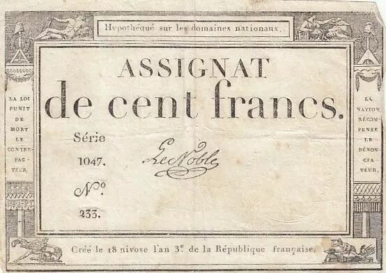 Banknote France 100 Francs - 18 Nivose An III - (07.01.1795) - Sign. Le Noble - Serial 1047