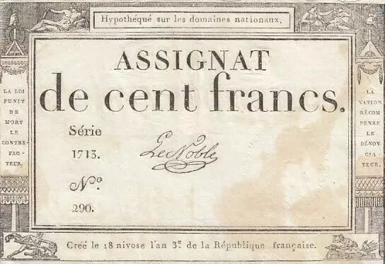 Banknote France 100 Francs - 18 Nivose An III - (07.01.1795) - Sign. Le Noble - Serial 1713