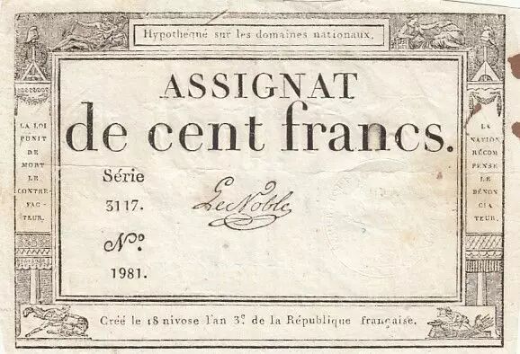Banknote France 100 Francs - 18 Nivose An III - (07.01.1795) - Sign. Le Noble - Serial 3117