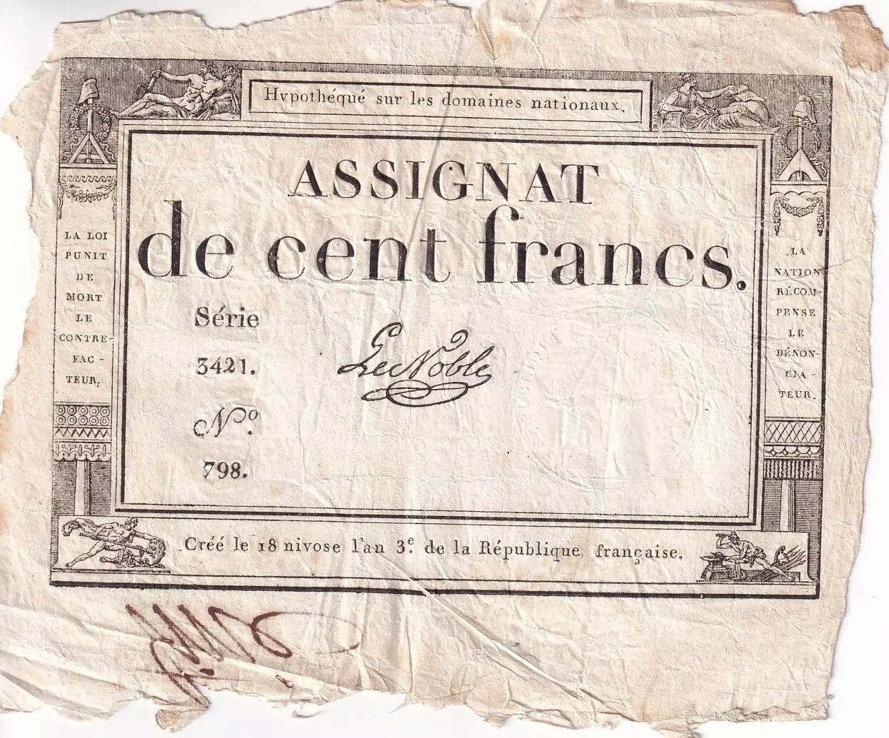 Banknote France 100 Francs - 18 Nivose An III - (07.01.1795) - Sign. Le Noble - Serial 3421