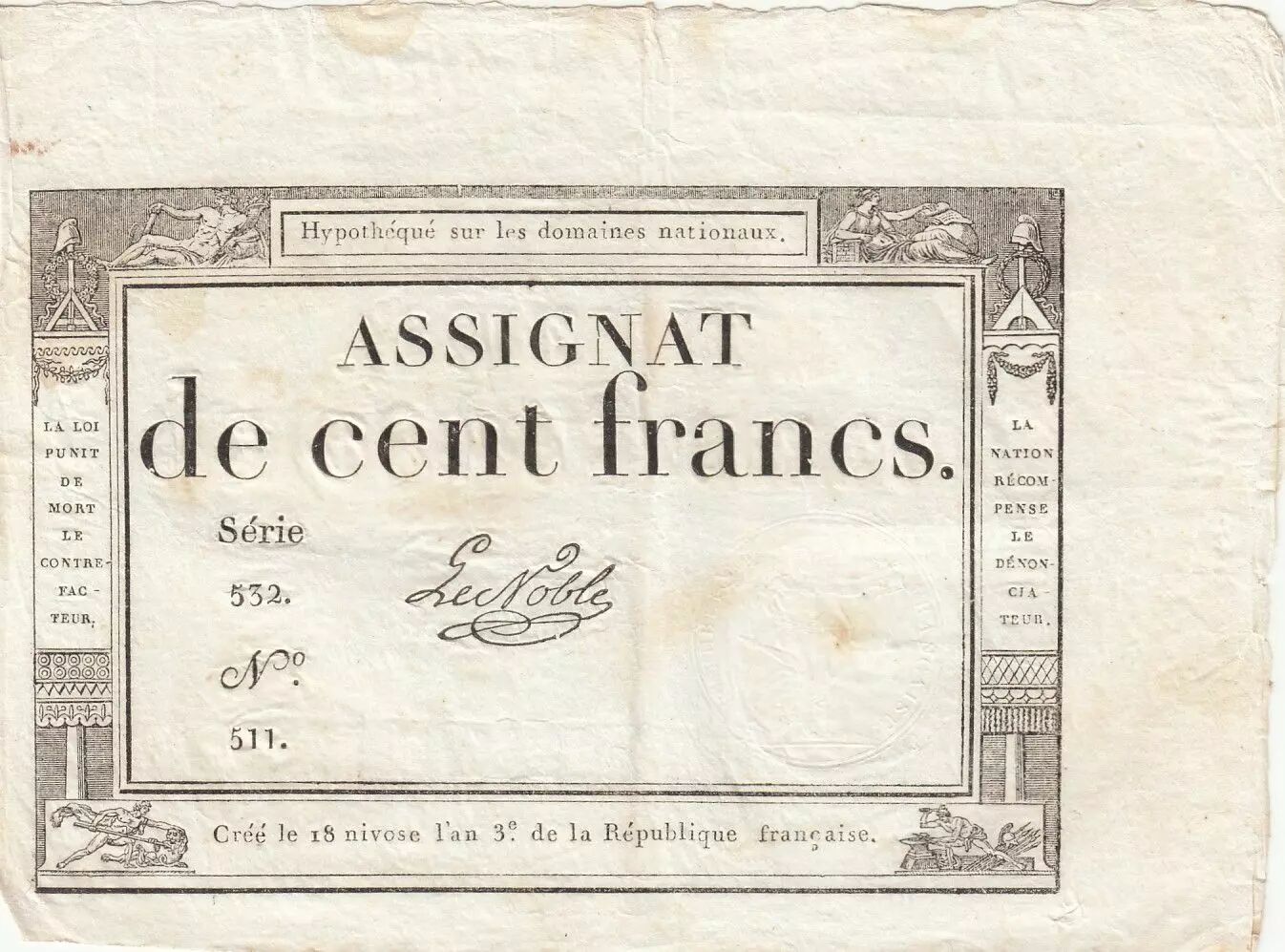 Banknote France 100 Francs - 18 Nivose An III - (07.01.1795) - Sign. Le Noble - Serial 532
