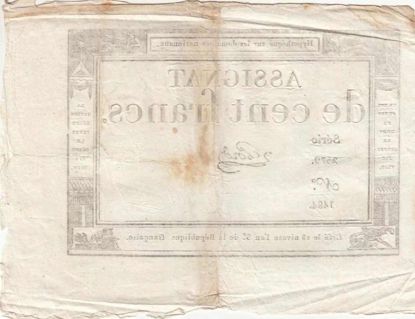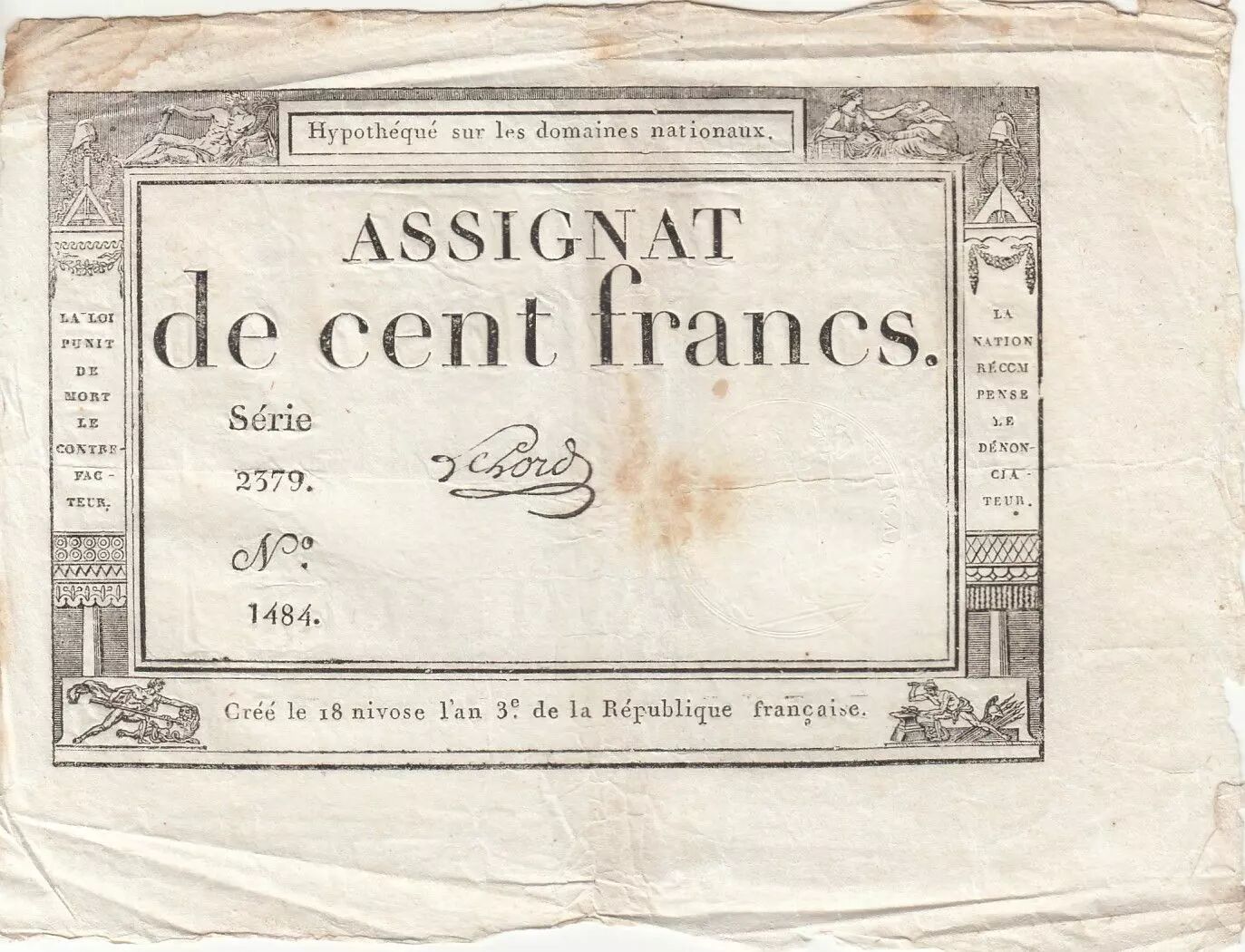 Banknote France 100 Francs - 18 Nivose An III - (07.01.1795) - Sign. Lehord - Serial 2379