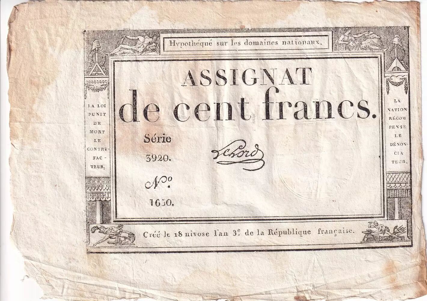 Banknote France 100 Francs - 18 Nivose An III - (07.01.1795) - Sign. Lehord - Serial 3920
