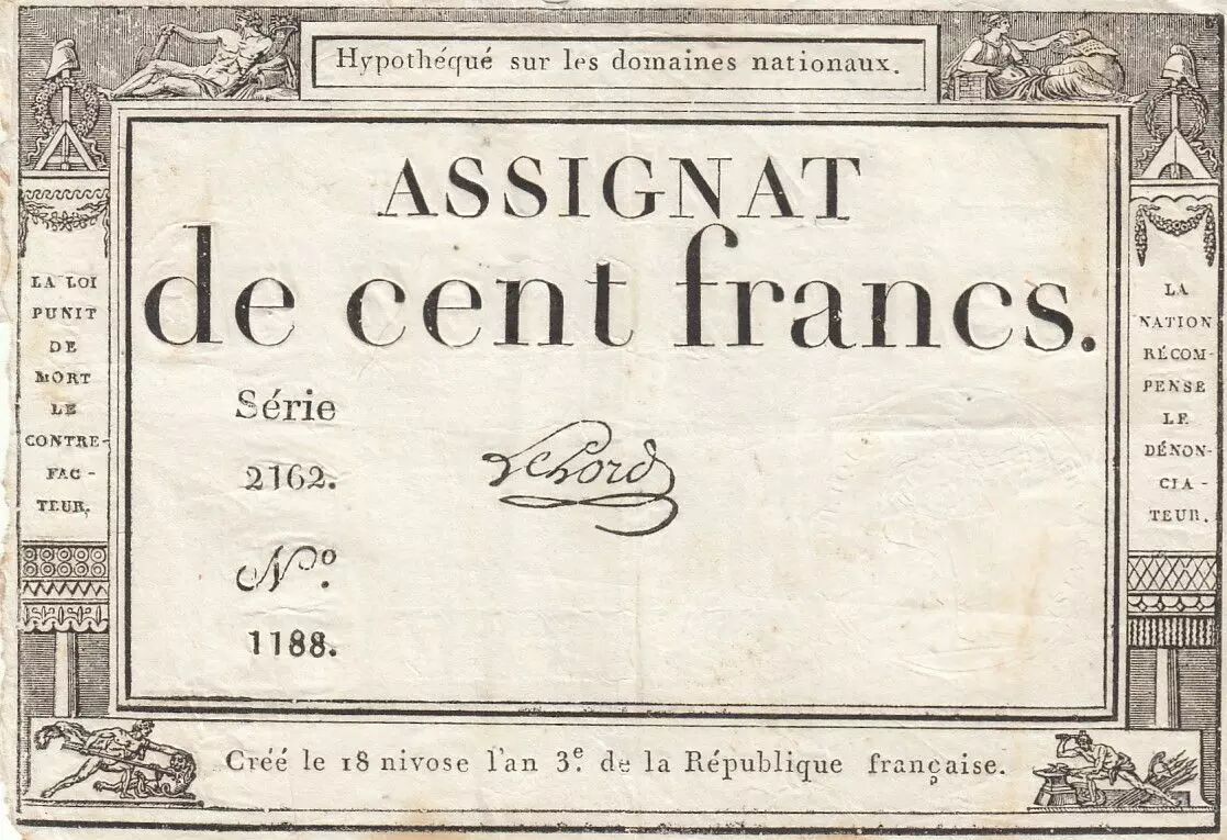 Billet France 100 Francs - 18 Nivose An III - (07.01.1795) - Sign. Lehord - Série 2162
