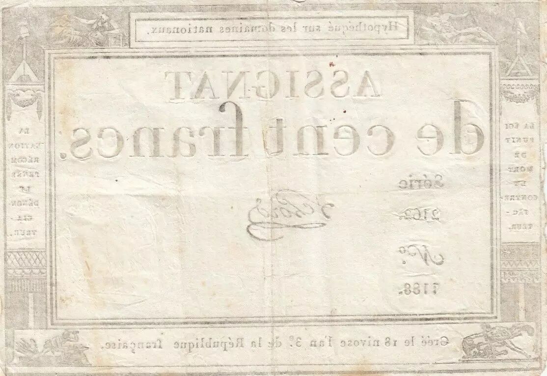 Accueil > Archivage > archivage-Billets Français > France 100 Francs - 18 Nivose An III - (07.01.1795) - Sign. Lehord - Série 2162