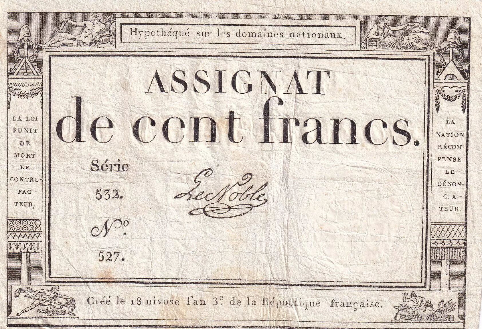Billet France 100 Francs - 18 Nivose An III - (07.01.1795) - Sign. Lenoble - Série 532 - L.173