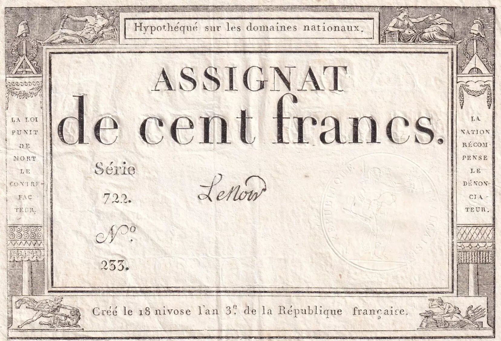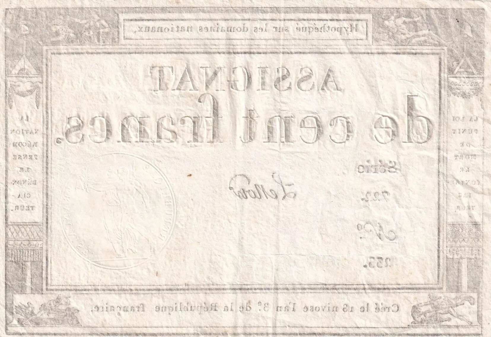 Banknote France 100 Francs - 18 Nivose An III - (07.01.1795) - Sign. Lenoir - Serial 722