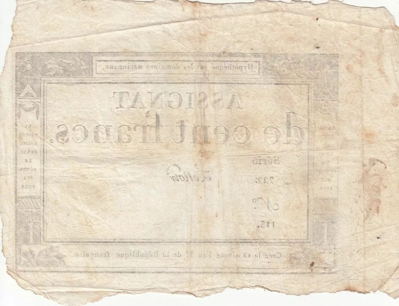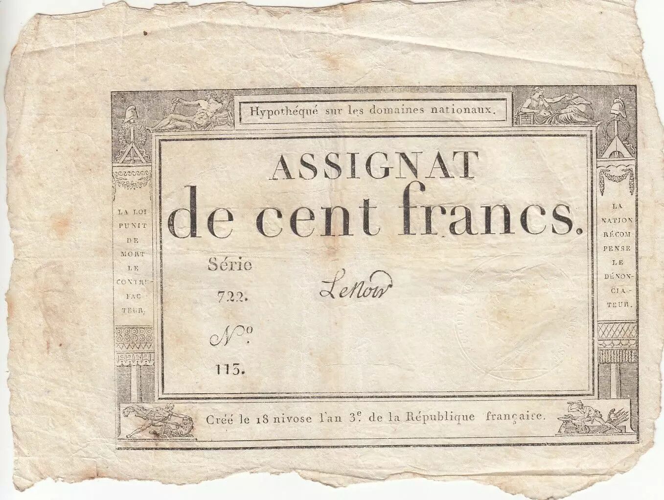 Banknote France 100 Francs - 18 Nivose An III - (07.01.1795) - Sign. Lenoir - Serial 722