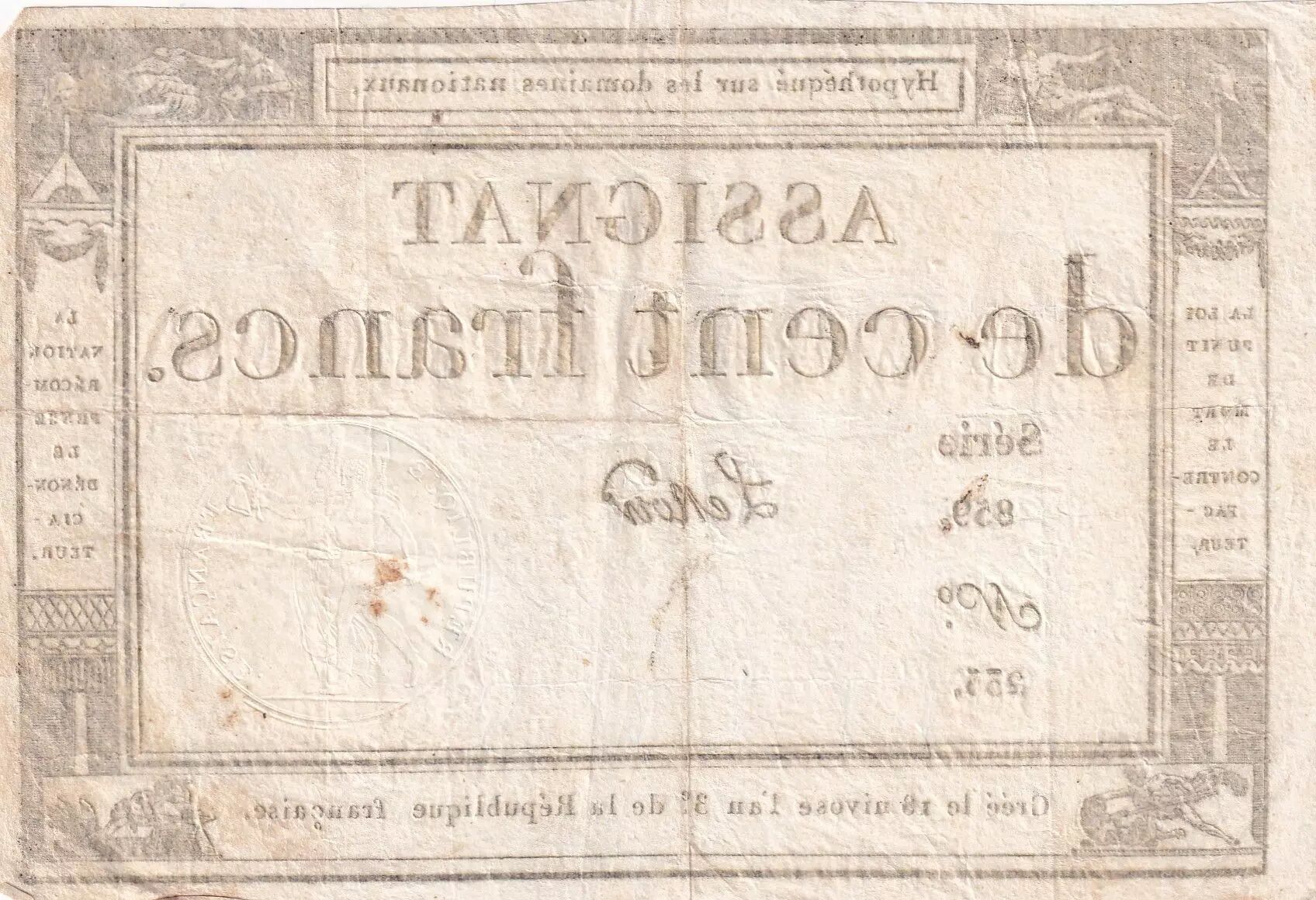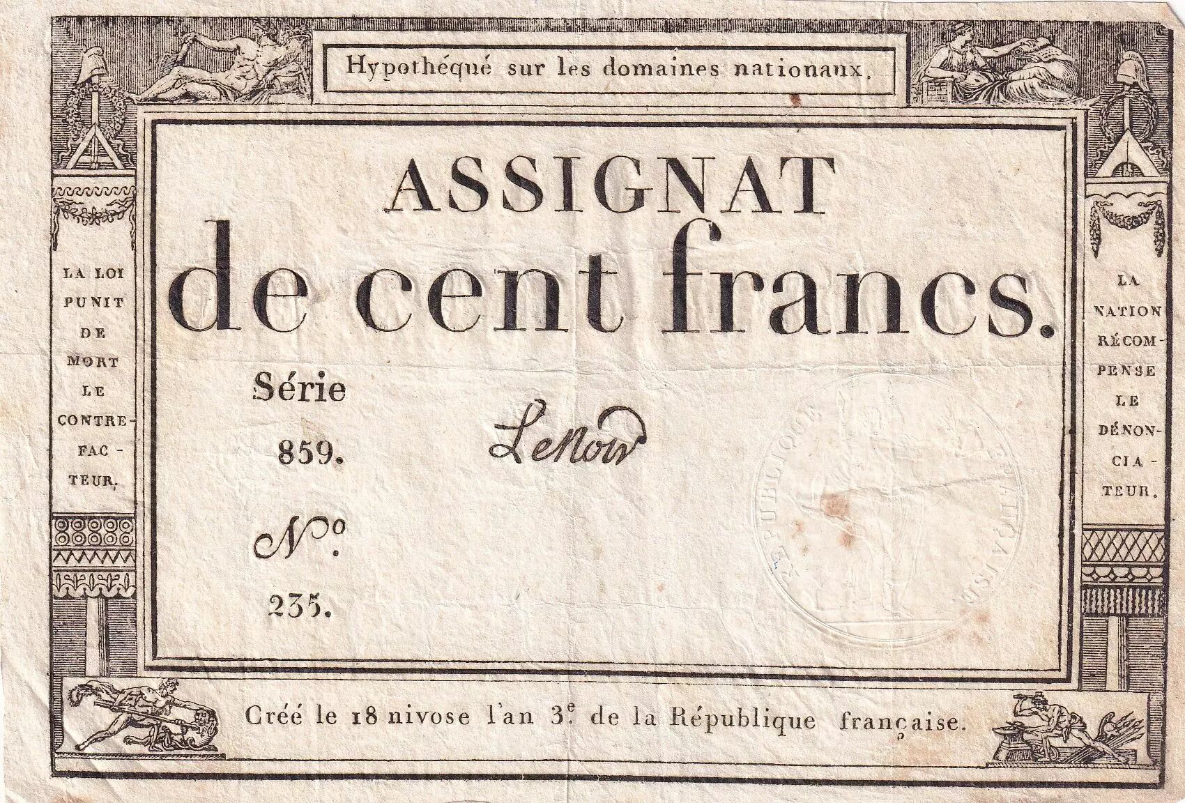 Banknote France 100 Francs - 18 Nivose An III - (07.01.1795) - Sign. Lenoir - Serial 859