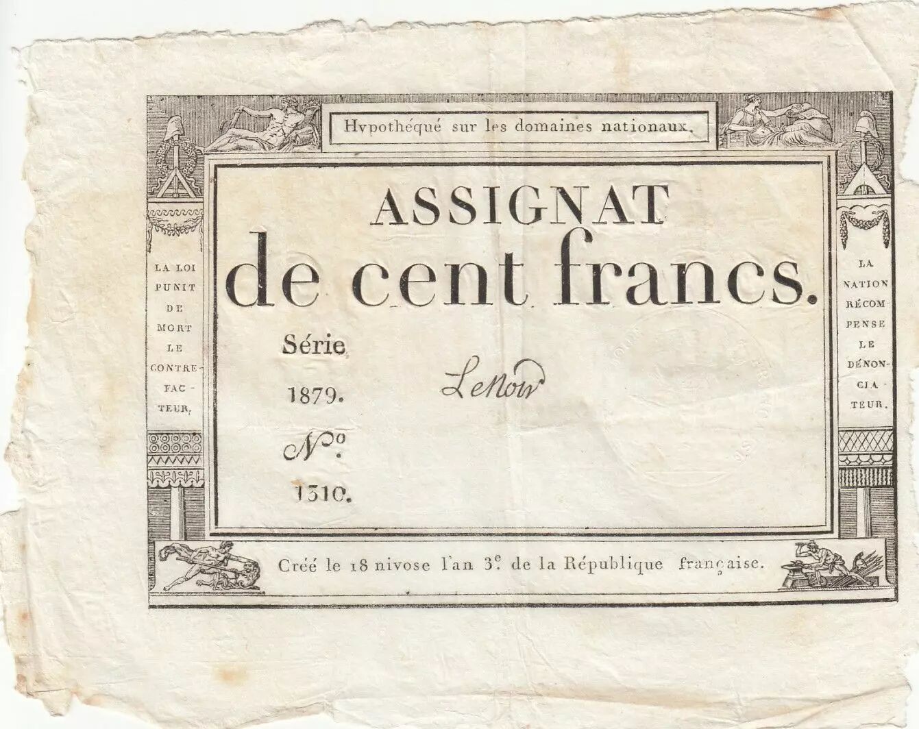 Accueil > Billets Français > Assignats > 100 Francs > France 100 Francs - 18 Nivose An III - (07.01.1795) - Sign. Lenoir - Série 1879