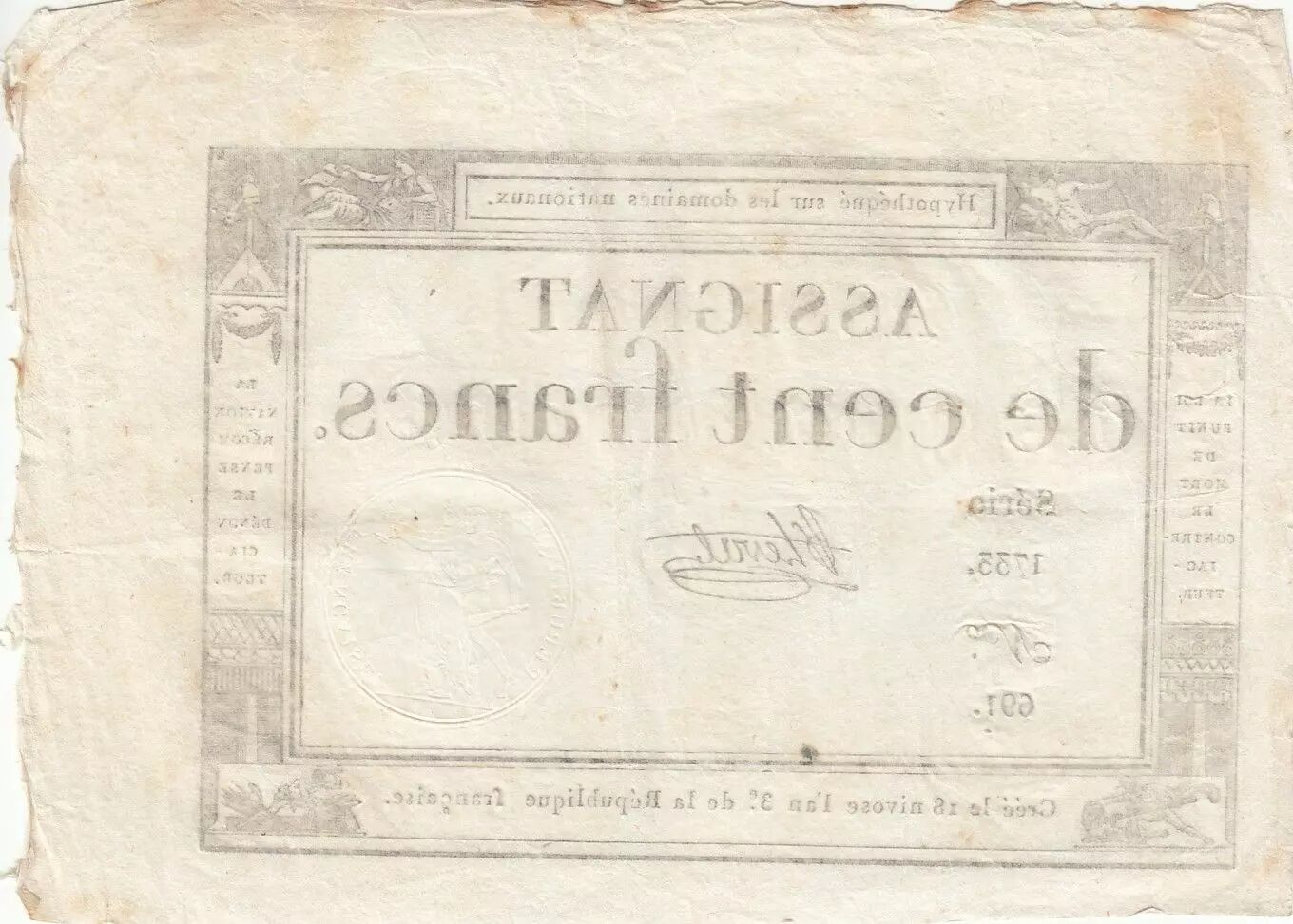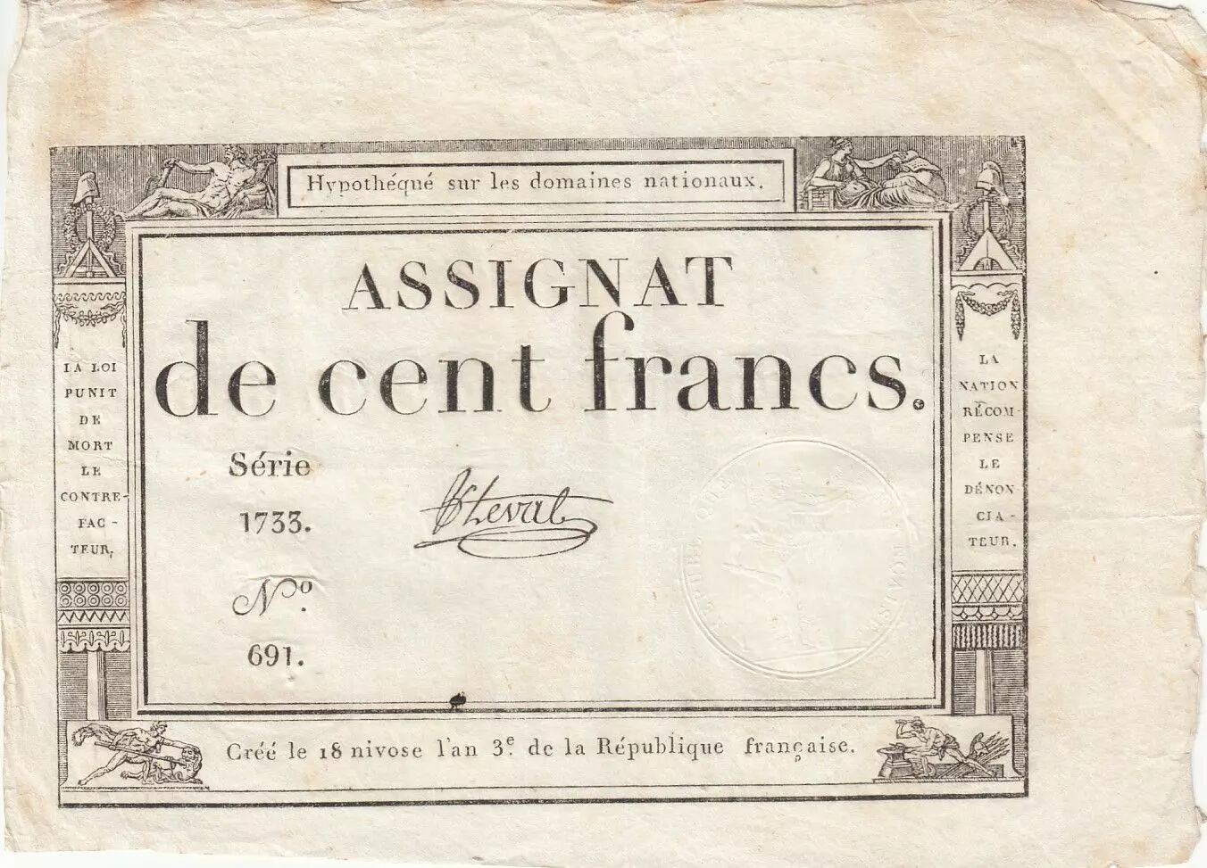 Banknote France 100 Francs - 18 Nivose An III - (07.01.1795) - Sign. Leval - Serial 1733