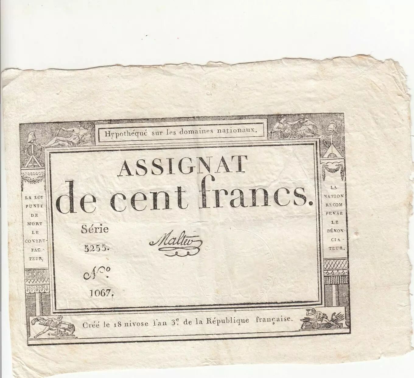Banknote France 100 Francs - 18 Nivose An III - (07.01.1795) - Sign. Malter - Serial 5255