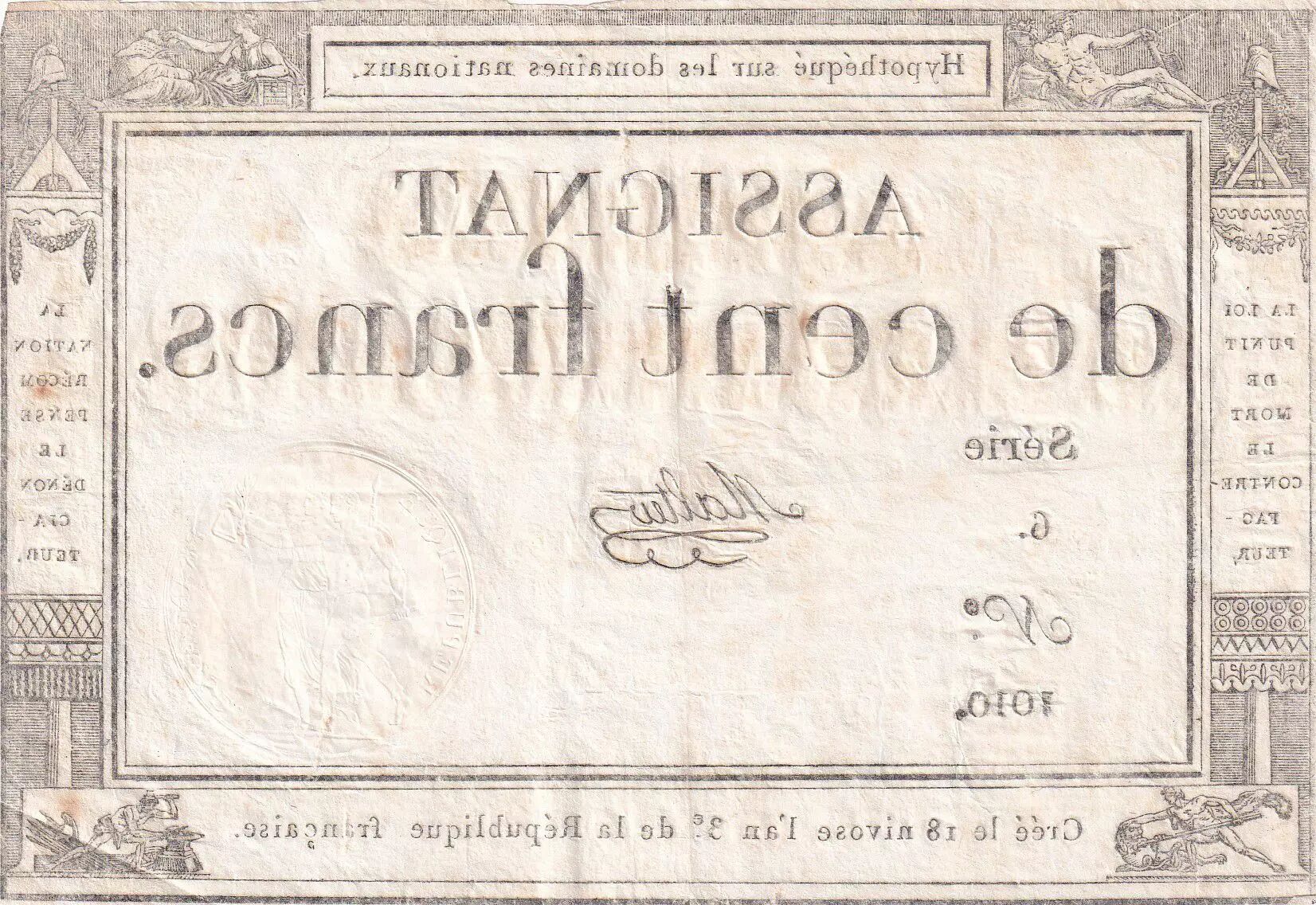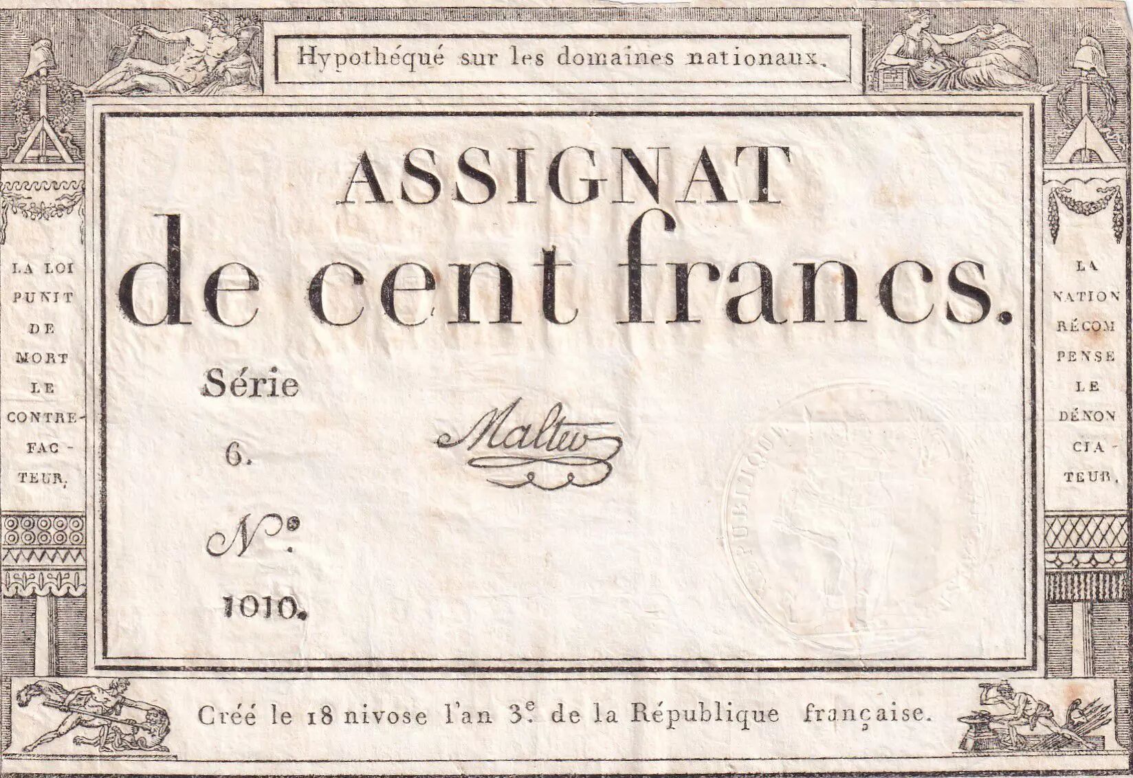 Banknote France 100 Francs - 18 Nivose An III - (07.01.1795) - Sign. Malter- Serial 6 - P.78