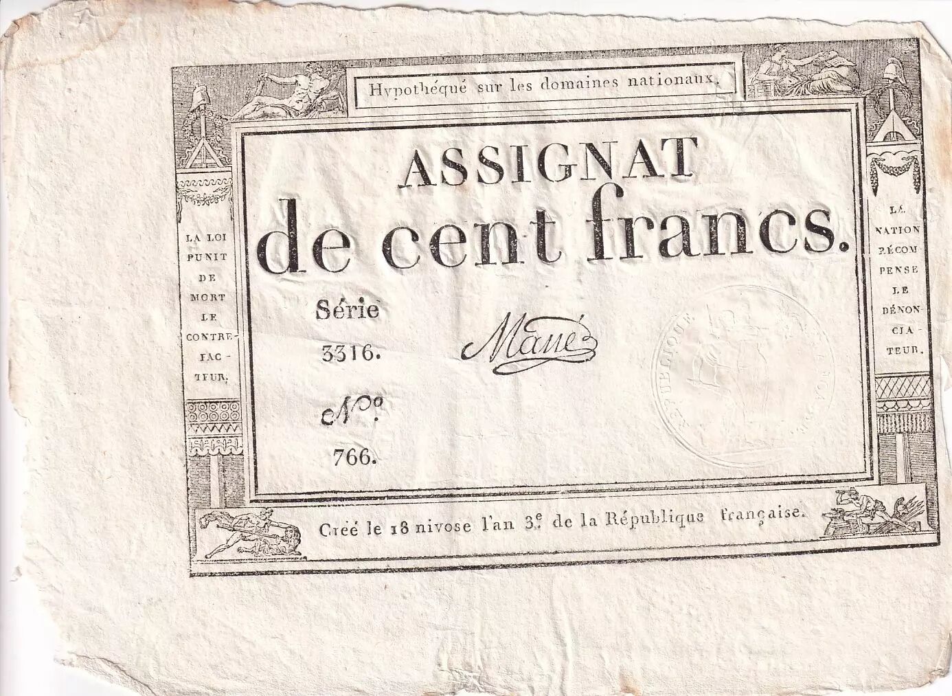 Accueil > Archivage > France 100 Francs - 18 Nivose An III - (07.01.1795) - Sign. Mane - Série 3316