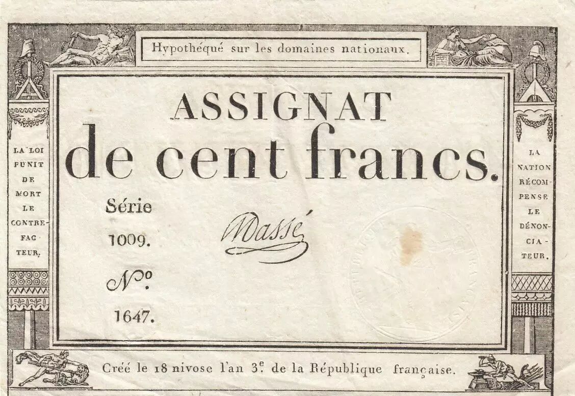 Banknote France 100 Francs - 18 Nivose An III - (07.01.1795) - Sign. Massé - Serial 1009