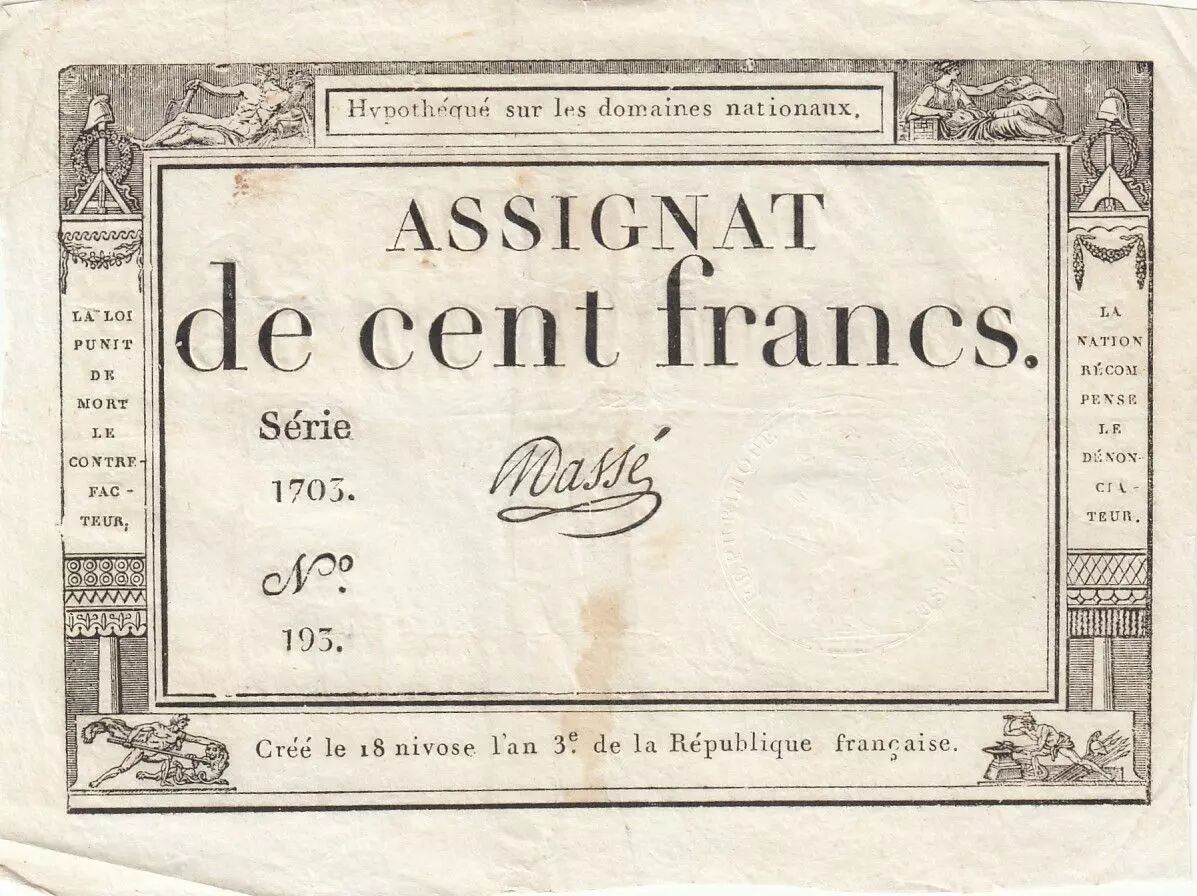 Banknote France 100 Francs - 18 Nivose An III - (07.01.1795) - Sign. Massé - Serial 1703