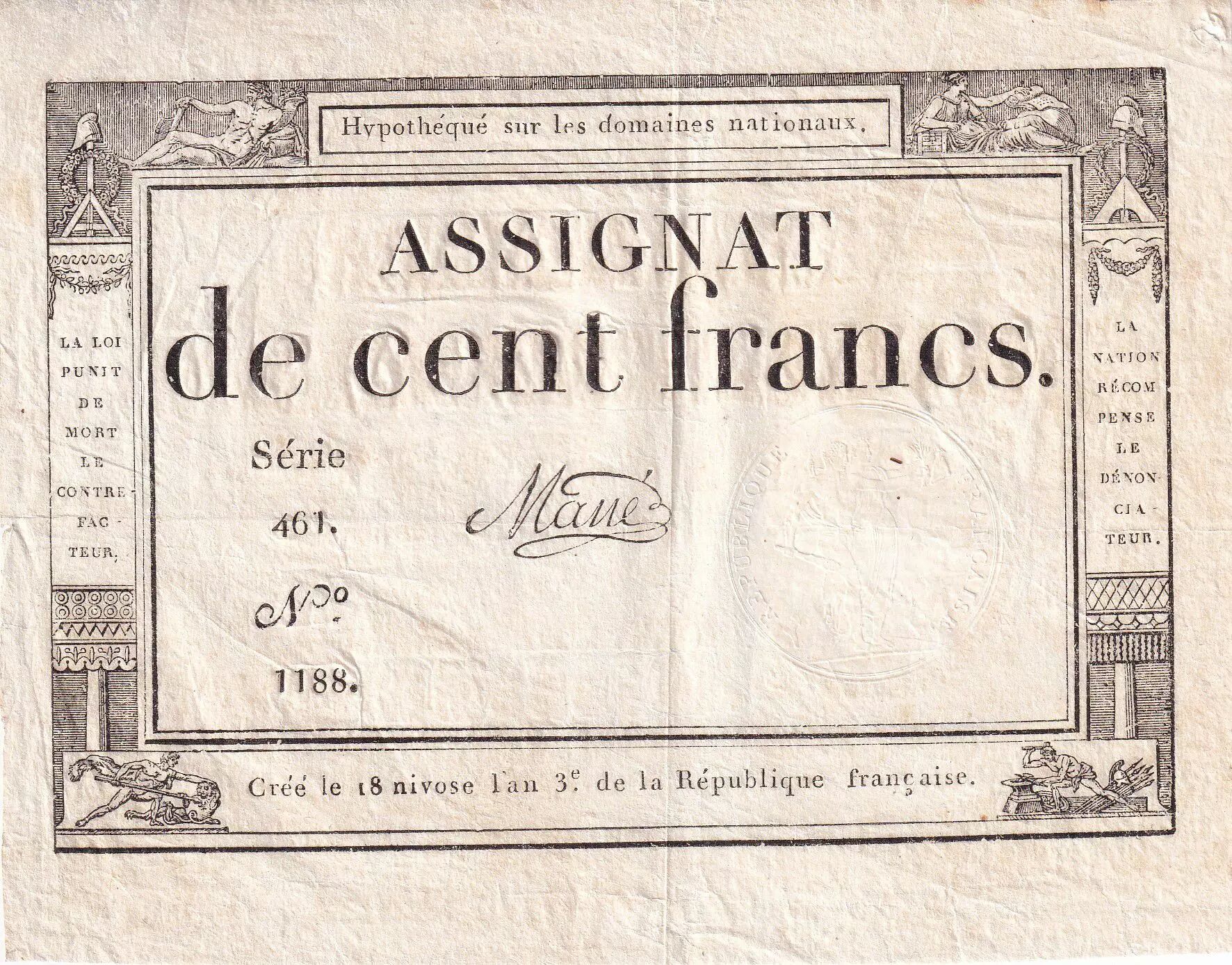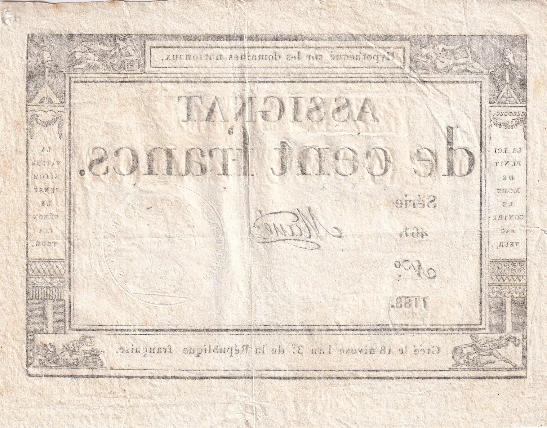 Banknote France 100 Francs - 18 Nivose An III - (07.01.1795) - Sign. Massé - Serial 461 - P.78
