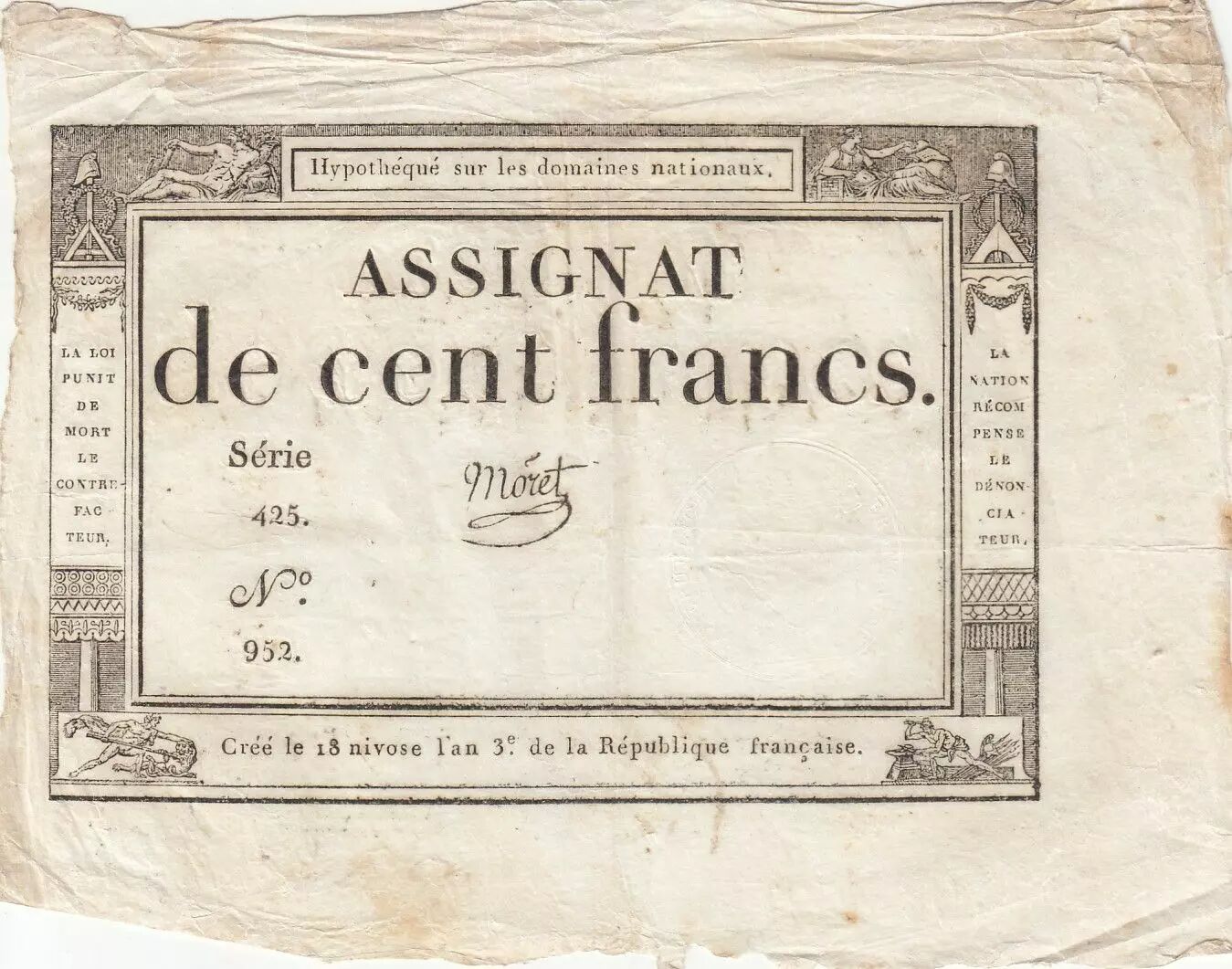 Billet France 100 Francs - 18 Nivose An III - (07.01.1795) - Sign. Moret - Série 425