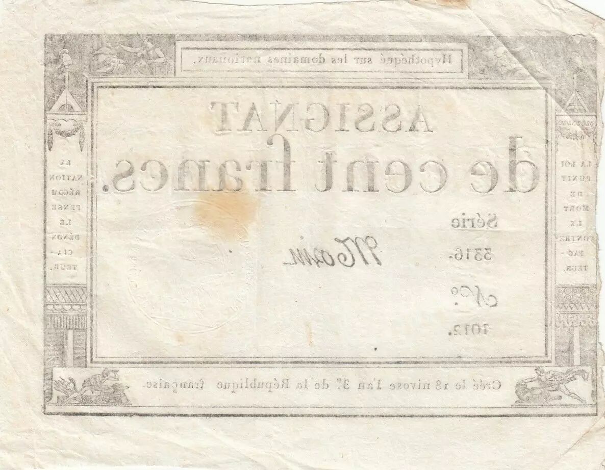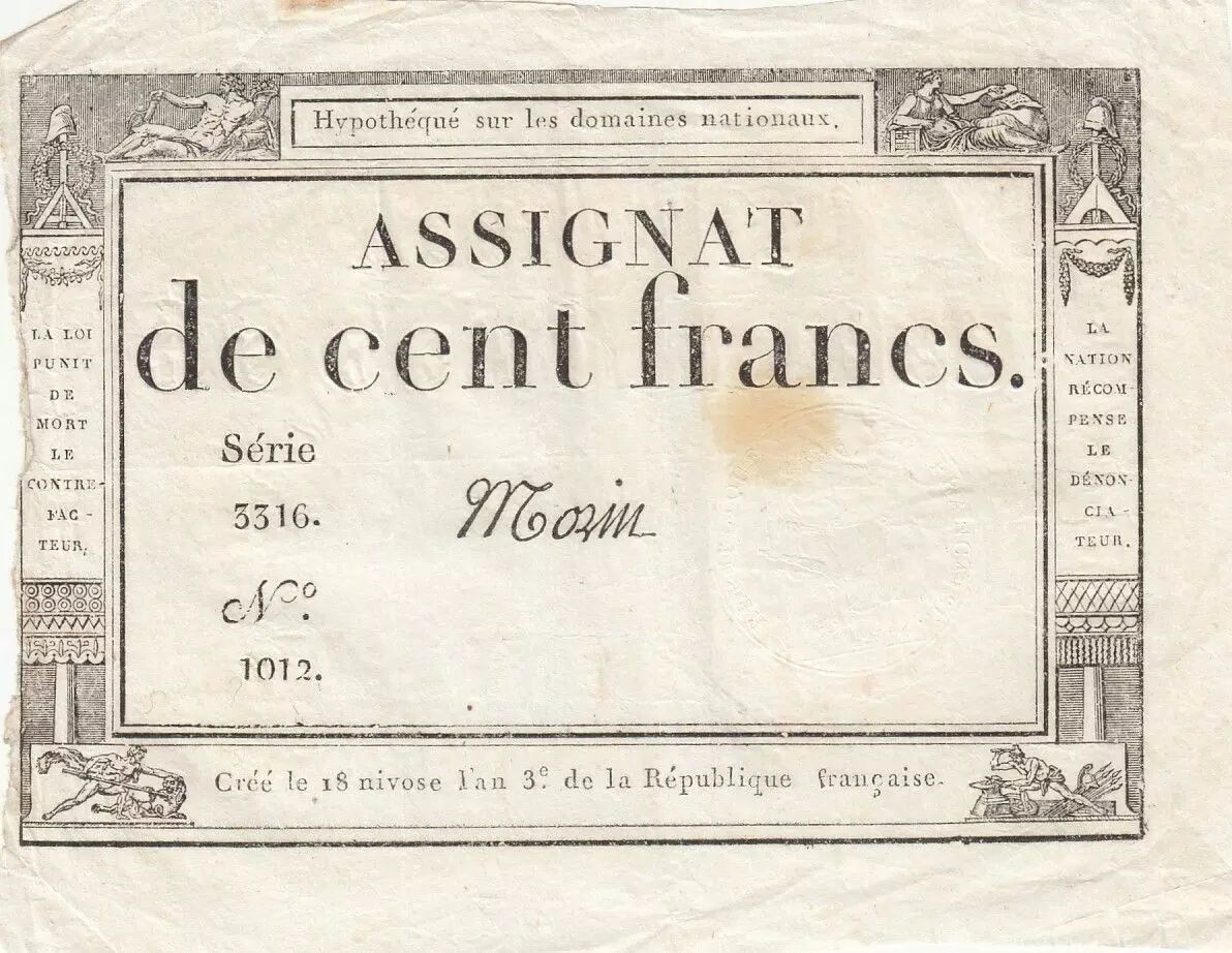 Banknote France 100 Francs - 18 Nivose An III - (07.01.1795) - Sign. Morin - Serial 3316