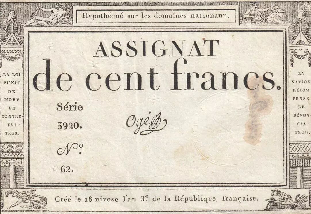 Banknote France 100 Francs - 18 Nivose An III - (07.01.1795) - Sign. Ogé - Serial 3920