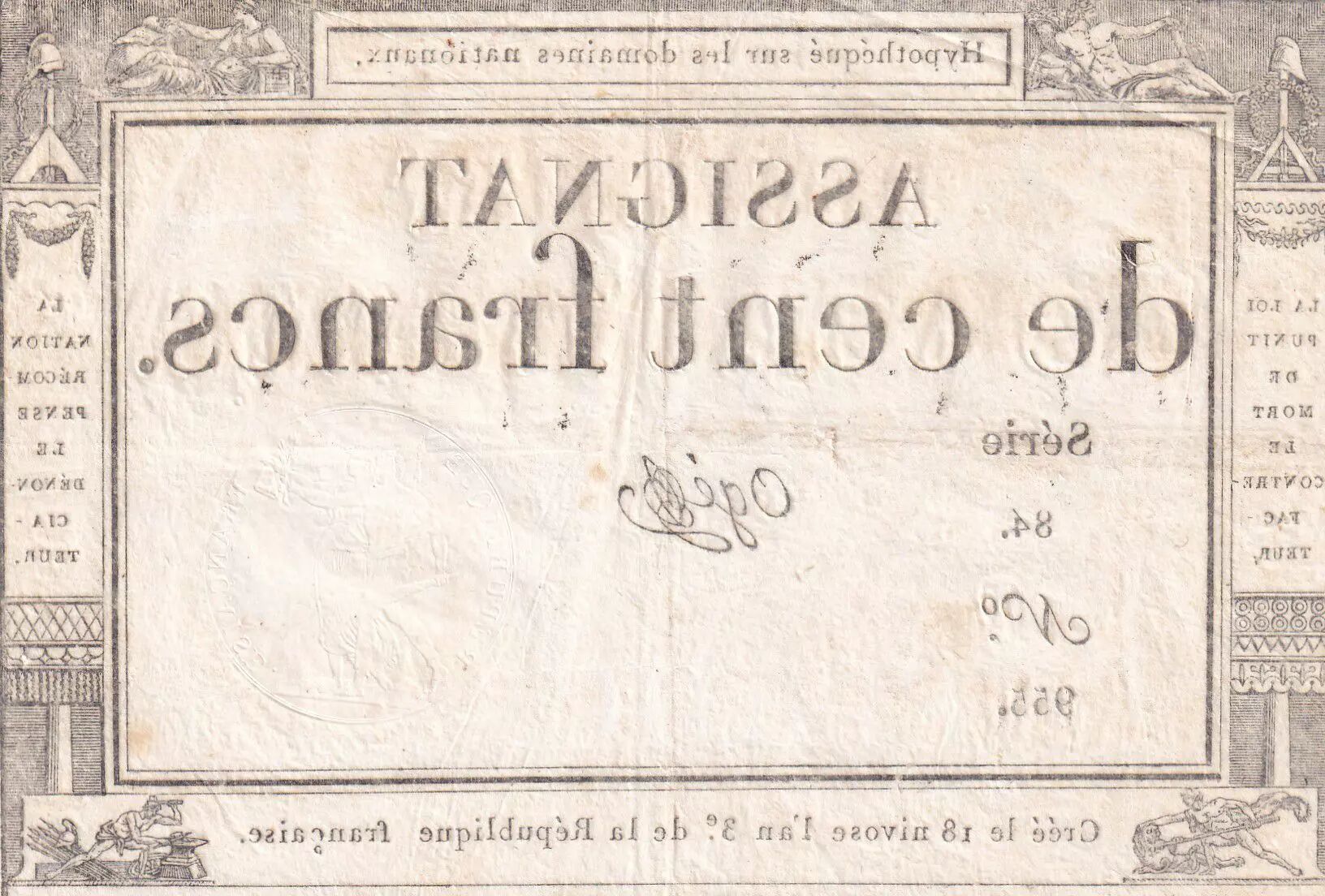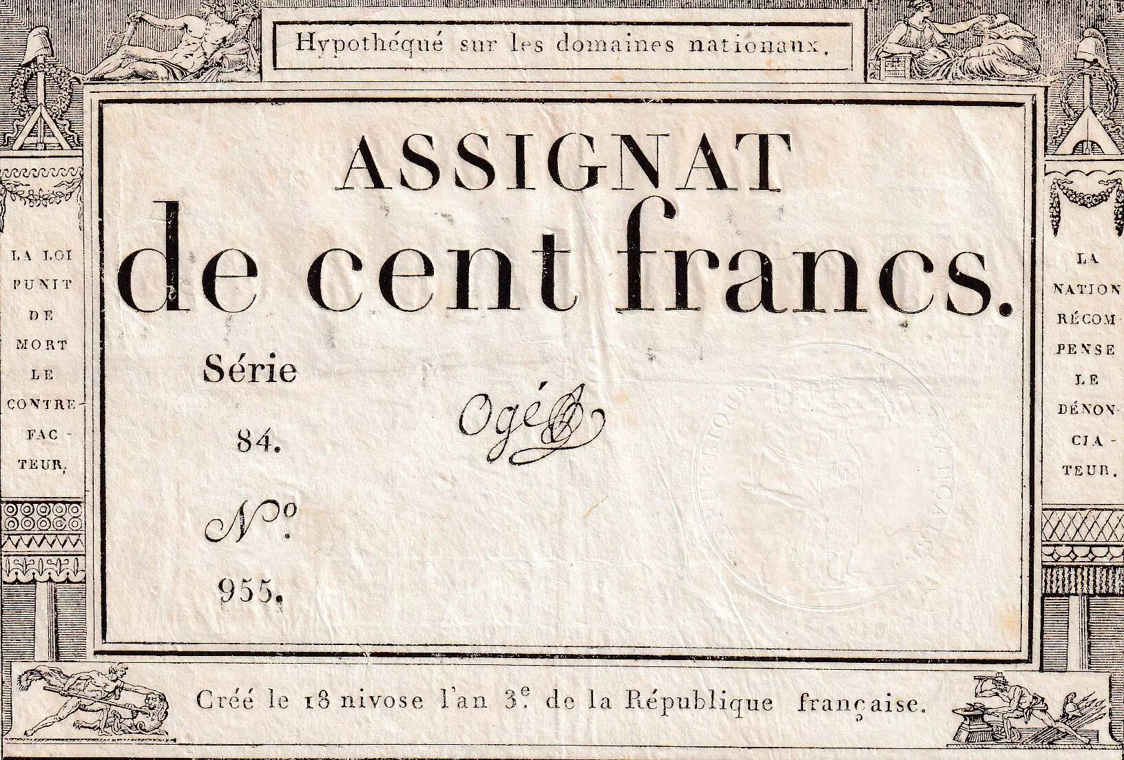 Accueil > Archivage > France 100 Francs - 18 Nivose An III - (07.01.1795) - Sign. Ogé - Série 84 - L.173