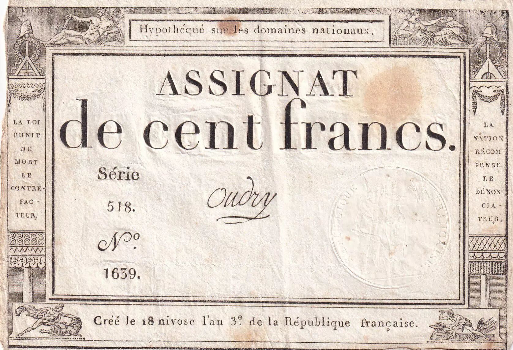 Accueil > Archivage > France 100 Francs - 18 Nivose An III - (07.01.1795) - Sign. Oudry - Série 518 - L.173