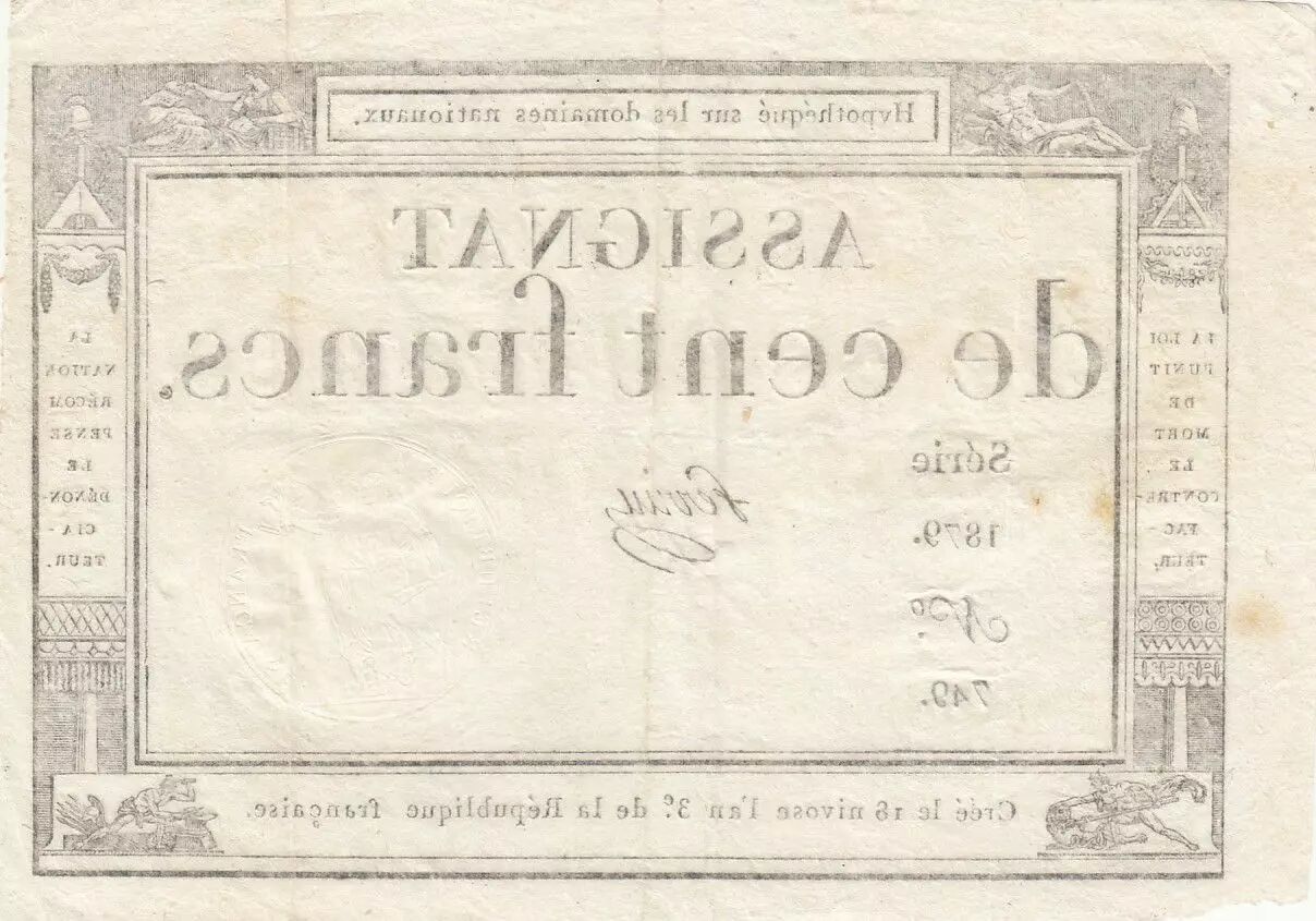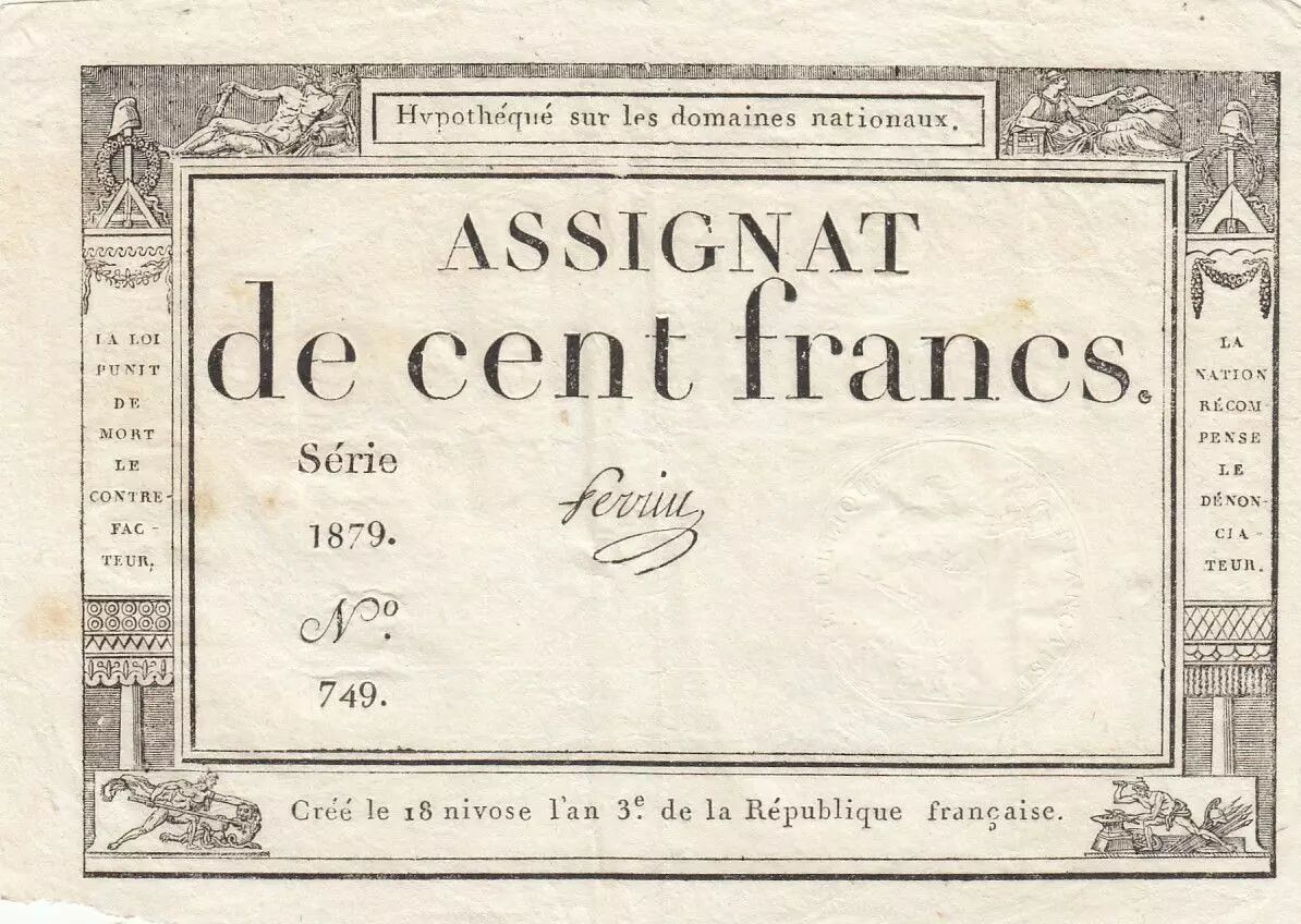 Banknote France 100 Francs - 18 Nivose An III - (07.01.1795) - Sign. Perrin - Serial 1879