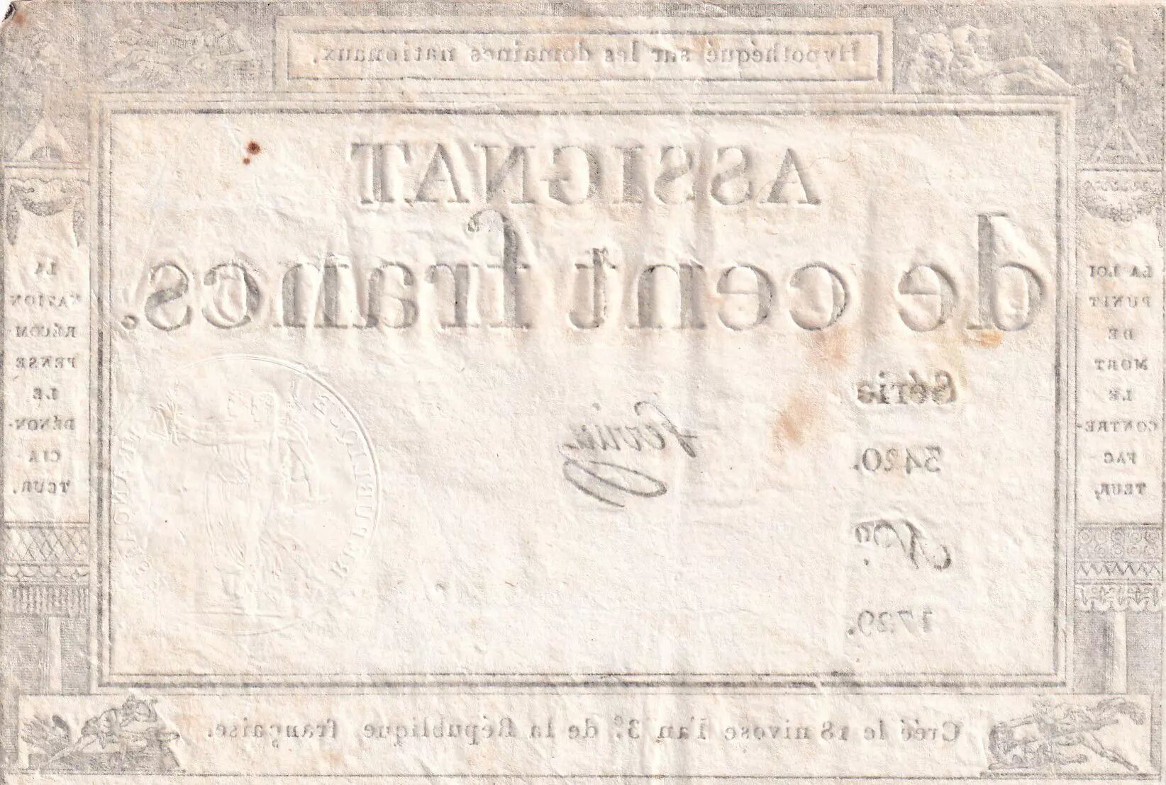 Banknote France 100 Francs - 18 Nivose An III - (07.01.1795) - Sign. Perrin - Serial 3420 - P.78