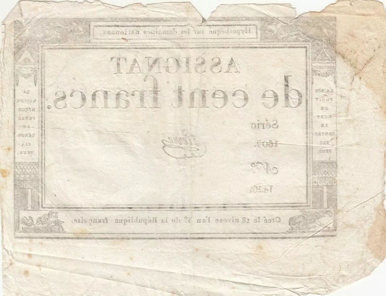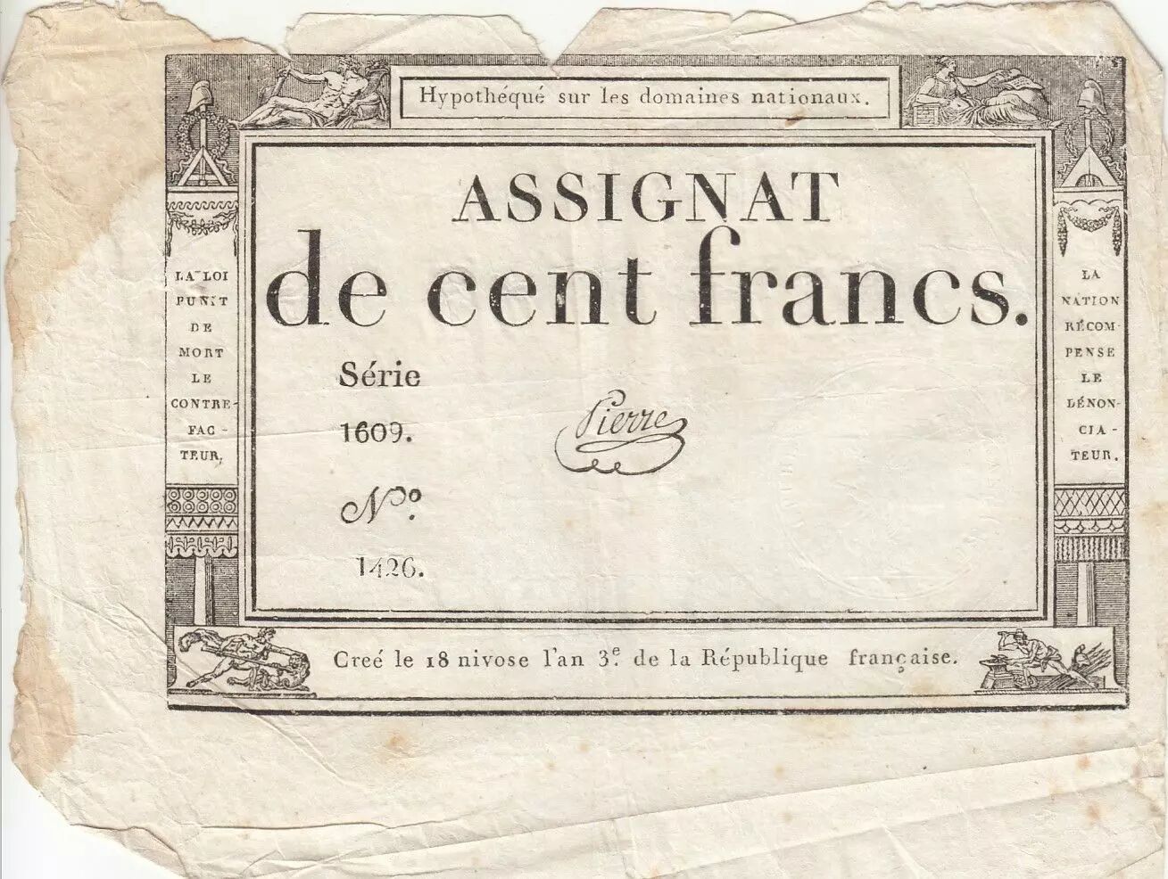 Accueil > Archivage > archivage-Billets Français > France 100 Francs - 18 Nivose An III - (07.01.1795) - Sign. Pierre - Série 1609