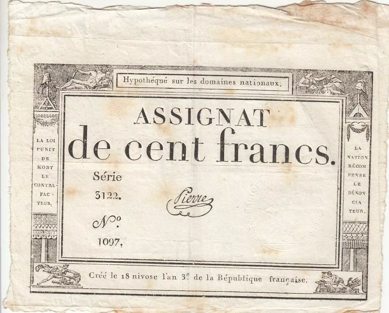 Billet France 100 Francs - 18 Nivose An III - (07.01.1795) - Sign. Pierre - Série 3122