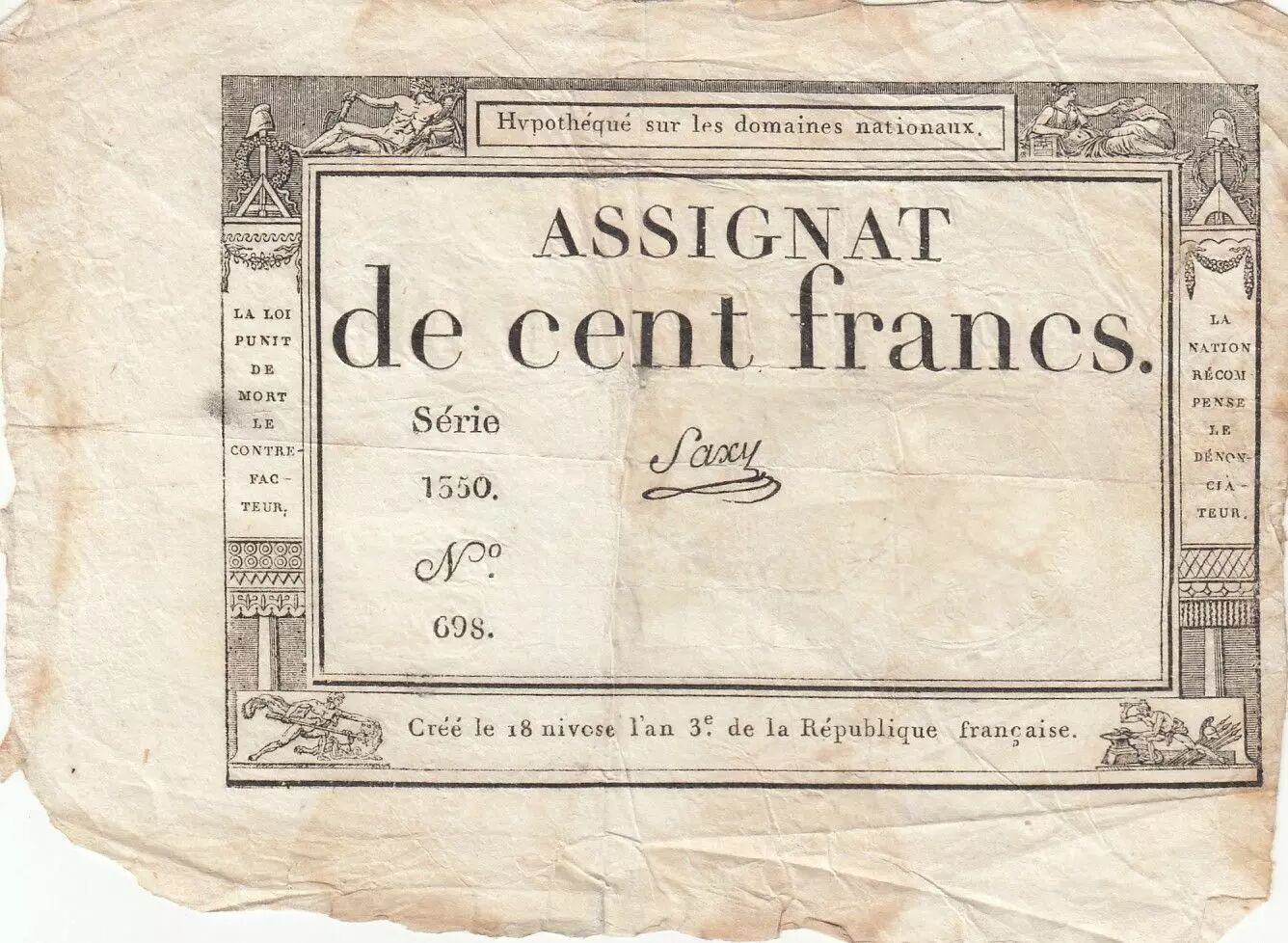 Home > French Banknotes > Assignats > 100 Francs > France 100 Francs - 18 Nivose An III - (07.01.1795) - Sign. Saxy - Serial 1350
