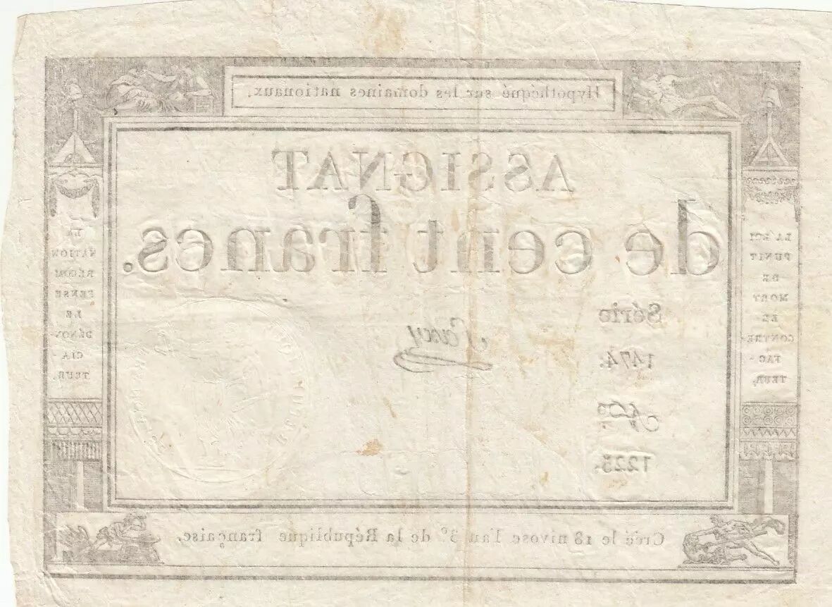 Banknote France 100 Francs - 18 Nivose An III - (07.01.1795) - Sign. Saxy - Serial 1474