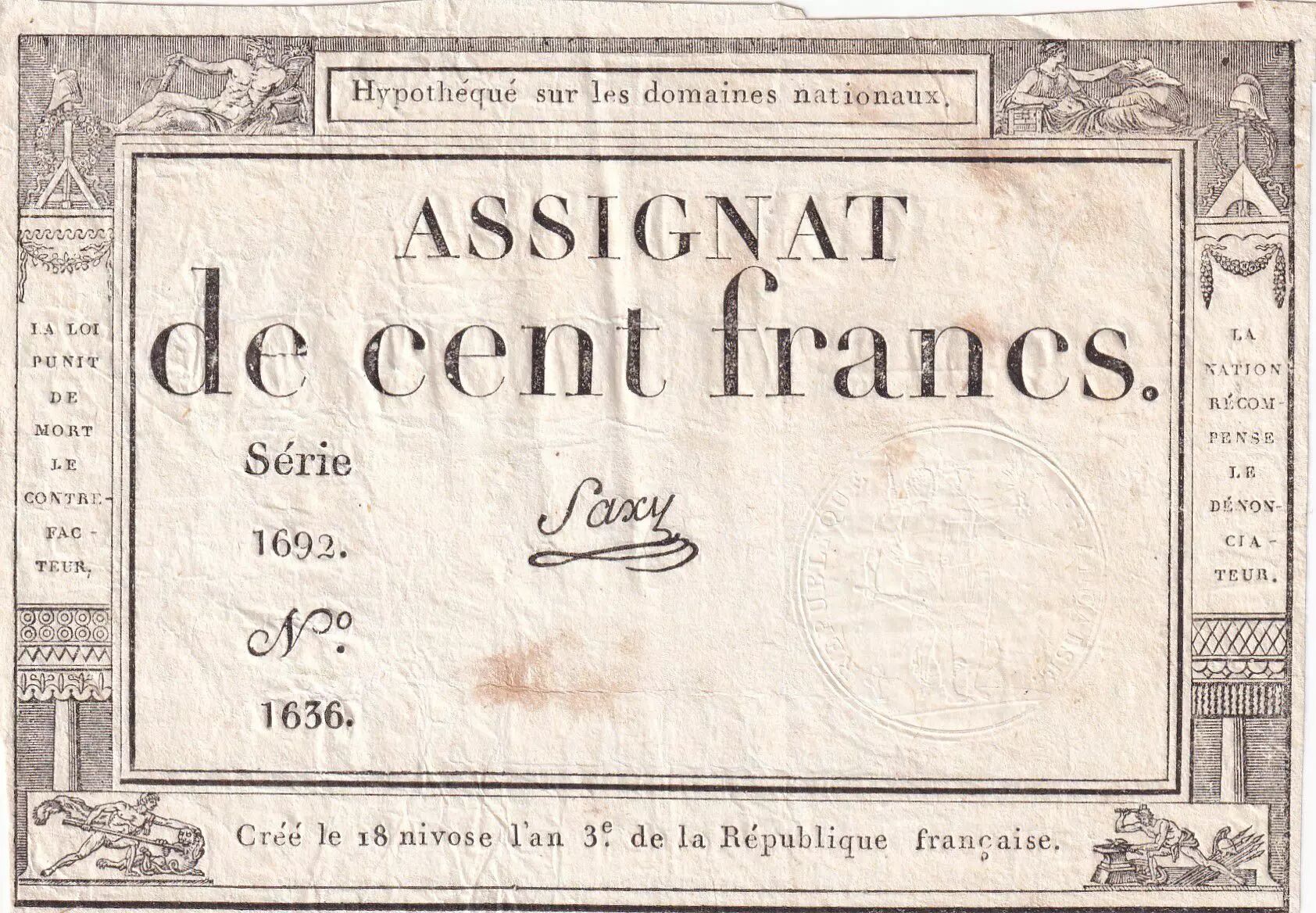 Banknote France 100 Francs - 18 Nivose An III - (07.01.1795) - Sign. Saxy - Serial 1692 - P.78
