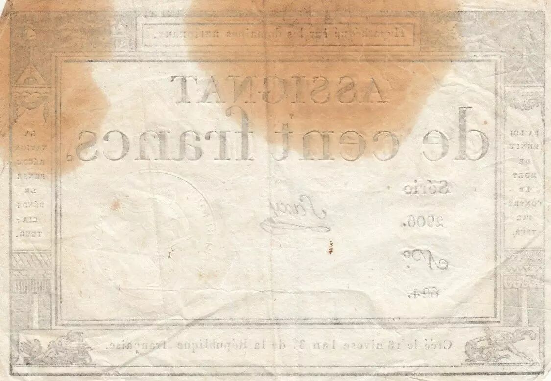 Banknote France 100 Francs - 18 Nivose An III - (07.01.1795) - Sign. Saxy - Serial 2906
